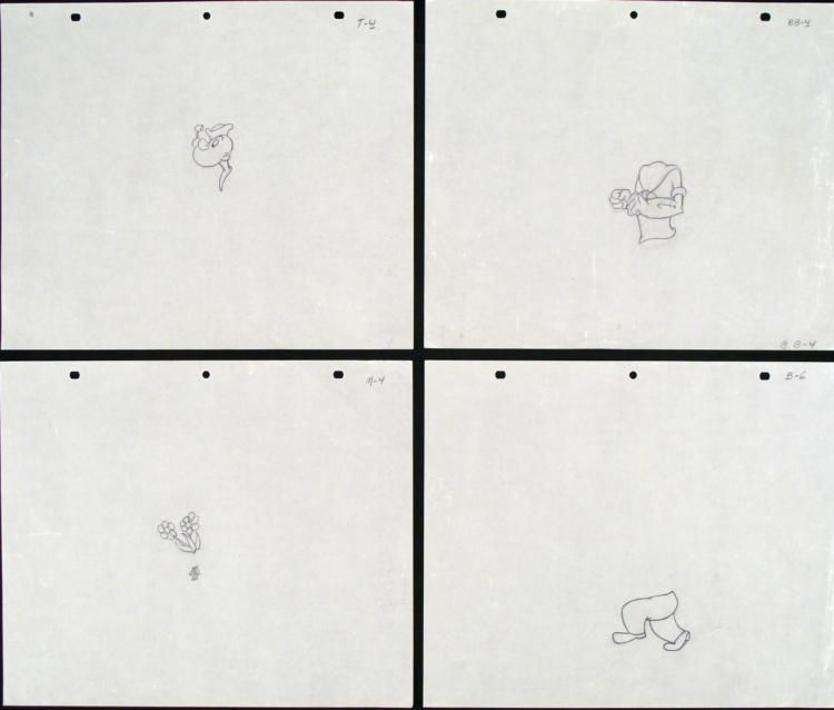 Even though there is no absolute sense of continuity in the stories, * certain plot and presentation elements remain mostly constant, including * purposeful contradictions in Popeye's capabilities. Though at times he * seems bereft of manners or uneducated, * Popeye is often depicted as capable of coming up with solutions to * problems that (to the police, or, most importantly, the scientific * community) seem insurmountable. Popeye has, alternatively, displayed * Sherlock Holmes-like investigative prowess, scientific * ingenuity (as his construction, within a few hours, of a * "spinach-drive" spaceship), or oversimplified (yet successful) * diplomatic argumentation (by presenting to diplomatic conferences his * own existence --- and superhuman strength --- as the only true guarantee * of world peace). Popeye's pipe also proves to be highly versatile. * Among other things, it has served as a cutting torch, jet engine, * propeller, periscope, and, of course, a whistle with which he produces * his trademark toot. * * * * * **The drawing is from the 1950's Popeye television show * series * Original Animation Drawing- * multi-layer with matching sheets on each * pageOriginal "rough" drawing that is in black * pencil, with the notations in blackOverall size is a * 12-field drawing that is 10 1/2" x 12 1/2"Very * good condition; drawing is missing Popeye's * mouth * Traditional animation is a * multi-step process which includes * various types of art techniques. Drawings are a key part of * the process, in which the animator creates the design and movement of * the characters. Drawings are then transferred onto acetate * cels * (by hand-inking and/or photo copying) to create a production * cel, which is then hand painted on the back side, using paint colors * chosen and approved by the creator of the series. * * * The drawing is ready to be matted and * framed. The animator's notations * are located at the top of the drawing.