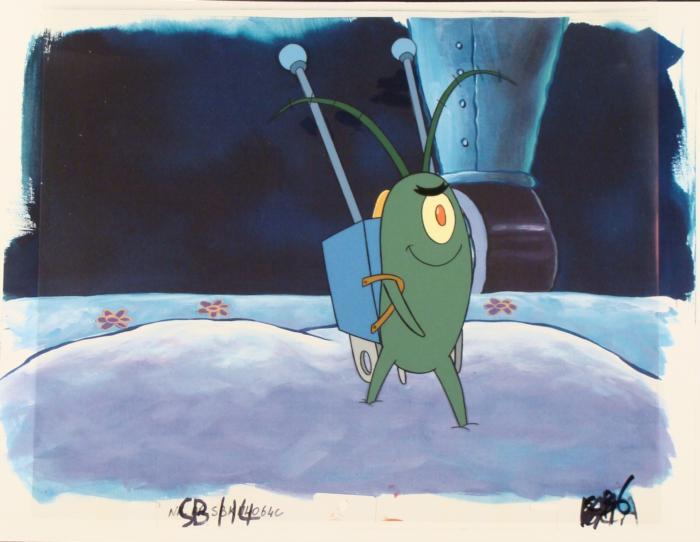 This animation cel and reproduction background are from the Nickelodeon TV show SpongeBob Squarepants. The story takes place under the deep blue sea in Bikini Bottom, where SpongeBob resides. SpongeBob, who is a yellow, porous sponge, is your typical happy-go-lucky character, as he is always cheerful and enjoys making people laugh. Patrick Star, SpongeBob's neighbor who is a starfish, is your average children's show idiot, as he boasts knowing nothing and is often getting himself into ridiculous situations. Between the homes of these two lies the home of the miserable Squidward, a squid, who is known for being grouchy and playing tricks on SpongeBob and Patrick. Both SpongeBob and Squidward work at the Krusty Krab, a fast food business run by the greedy money-loving Mr. Krabs, a crab, the arch rival of the evil, possibly misunderstood, Plankton. Another neighbor, Sandy Cheeks, an athletic squirrel who normally wears an astronaut's space suit, was introduced in "Tea at the Treedome." She spends most of her time inventing and experimenting. Plankton is about to go into SpongeBob head.Original Printed Background and Animated Cel Overall Size of Background: 11" x 17" Overall Size of the Cel: 10 1/2" x 12 1/2" Very good condition This is an original hand-painted cel set-up used in the production of an episode of "SpongeBob SquarePants." Each one-of-a-kind set-up represents a slight change in position of the characters. When individually photographed and projected in rapid succession, the images appear to move.