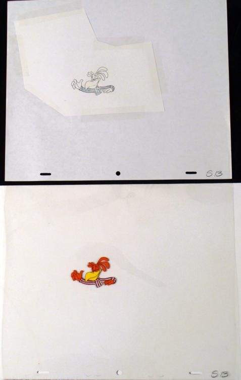 It's okay Sonny, just take deep breaths... This soon will pass... * Original Animation Cel * and * Copied Drawing in non-photo blue pencilOverall * size: 10 1/2" x 12 1/2"Overall condition: Very * good * This is an original hand-painted cel * used in the TV commercial of "Coco * Puffs". Each cel represents a slight change in position of the * characters. When individually photographed and projected in rapid * succession, the images appear to * move.To create production cels, the original animator's drawing is * transferred onto an acetate cel (by hand-inking and/or photo copying). * The cel is then hand-painted on the reverse side. * * The * cel and drawing are * ready to be matted and framed. The animator's * notations are at the bottom of both. The copied drawing is * taped to a piece of paper. *