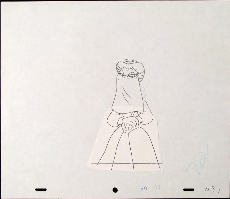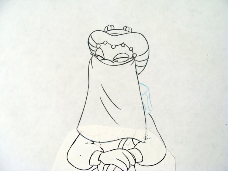 This is an original animation drawing of what looks like to be a princess in disguise. * * No one will everyone will know its me... * * * Original Animation * DrawingOriginal "rough" animation drawing in black and non-photo * blue * pencil, with the notations in black and non-photo blue * * Size of drawing: 10 1/2" x 12 1/2" * * Condition: Excellent * * Traditional animation is a multi-step process which includes various * types of art techniques. Drawings are a key part of the process, in * which the animator creates the design and movement of the characters. * Drawings are then transferred onto acetate cels * (by hand-inking and/or photo copying) to create * a production cel, which is then hand painted on the back side, * using paint colors chosen and approved by the creator of the * series. * * The drawing is ready to be framed and matted * with the animator's notations at the bottom. Half of the drawing has been copied and taped to the original drawing. There appears to be a signature at the bottom of the drawing. *