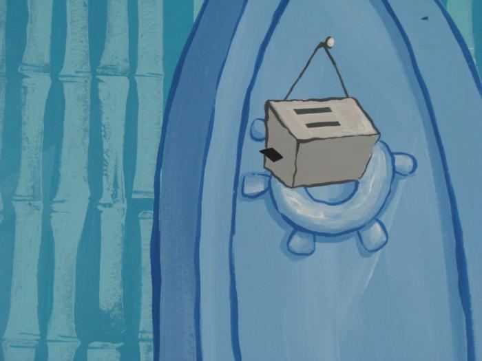 This original hand-painted background from the Nickelodeon TV show SpongeBob Squarepants. The story takes place under the deep blue sea in Bikini Bottom, where SpongeBob resides. SpongeBob, who is a yellow, porous sponge, is your typical happy-go-lucky character, as he is always cheerful and enjoys making people laugh. Patrick Star, SpongeBob's neighbor who is a starfish, is your average children's show idiot, as he boasts knowing nothing and is often getting himself into ridiculous situations. Between the homes of these two lies the home of the miserable Squidward, a squid, who is known for being grouchy and playing tricks on SpongeBob and Patrick. Both SpongeBob and Squidward work at the Krusty Krab, a fast food business run by the greedy money-loving Mr. Krabs, a crab, the arch rival of the evil, possibly misunderstood, Plankton. Another neighbor, Sandy Cheeks, an athletic squirrel who normally wears an astronaut's space suit, was introduced in "Tea at the Treedome." She spends most of her time inventing and experimenting.Why is there a toaster on a door?Original Production Background Overall Size of Background: 10 1/2" x 13 3/4" Very good condition; it has been stored Original Production Backgrounds are used in the making of the final version of animated productions. The background establishes the location and the overall good mood of the scenee. Typically, a background layout artist creates a drawing to establish the content of the scene, placement of characters, perspective and camera angle. Based on this drawing, the background artist creates a preliminary painting to confirm all of the scenes details, then the final production background which is used in the filming of the scene. When these backgrounds are individually photographed behind the progression of production cels, and projected at a rapid succession, the images in the foreground appear to move, creating an animated scene. The background is ready to be matted and framed. It is a colored background with the animator's notations at the bottom.