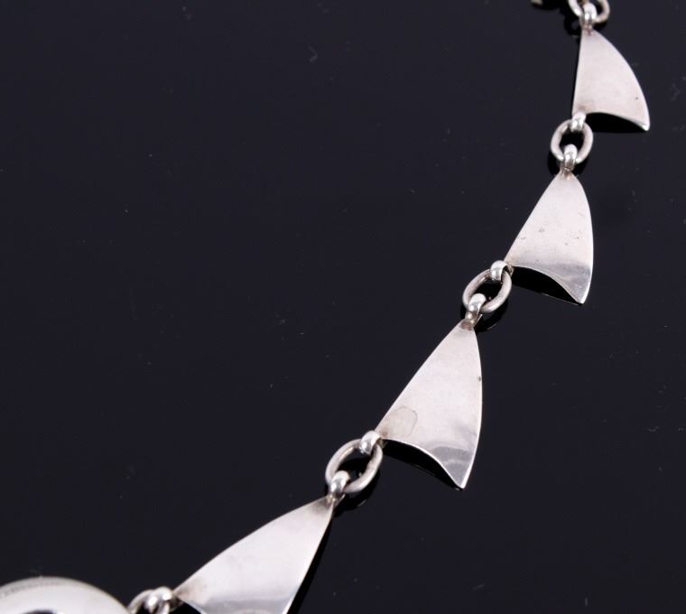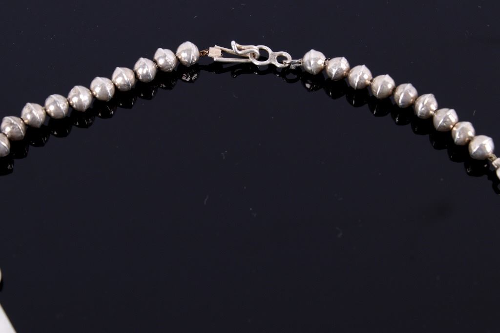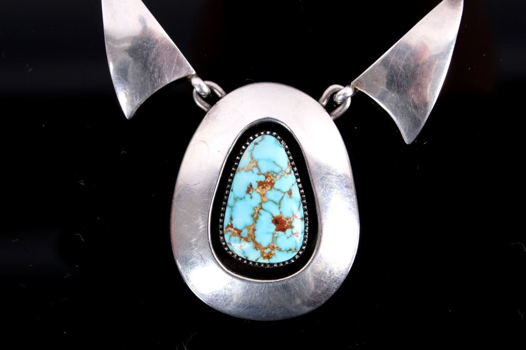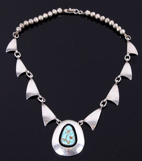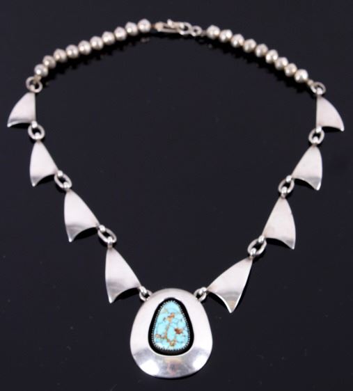 Included in this lot is a Santo Domingo Pueblo Morenci Turquoise necklace by Anthony Lovato. Anthony Lovato, son of notable lapidary artist Mary Coriz Lovato and grandson of Santiago Leo Coriz, was born on July 5, 1958. He is the fifth generation from the pueblo of Santa Domingo. This necklace features a gorgeous Morenci Turquoise gemstone highly polished with a detailed gold and brown matrix. The cabochon is accented by four sterling silver fins. The necklace is composed of sterling silver balls leading up to a clasp. The back of the pendant features two of the artists hallmarks. The necklace measures 15.5" long when unclasped.