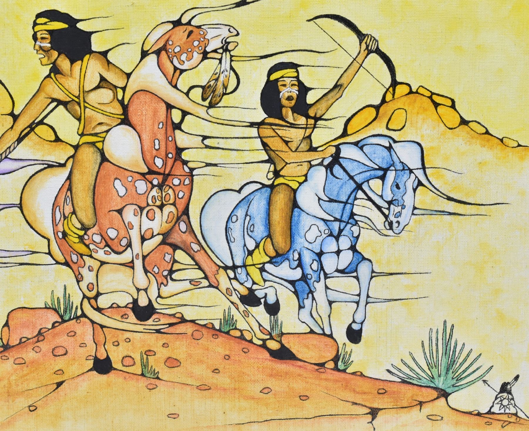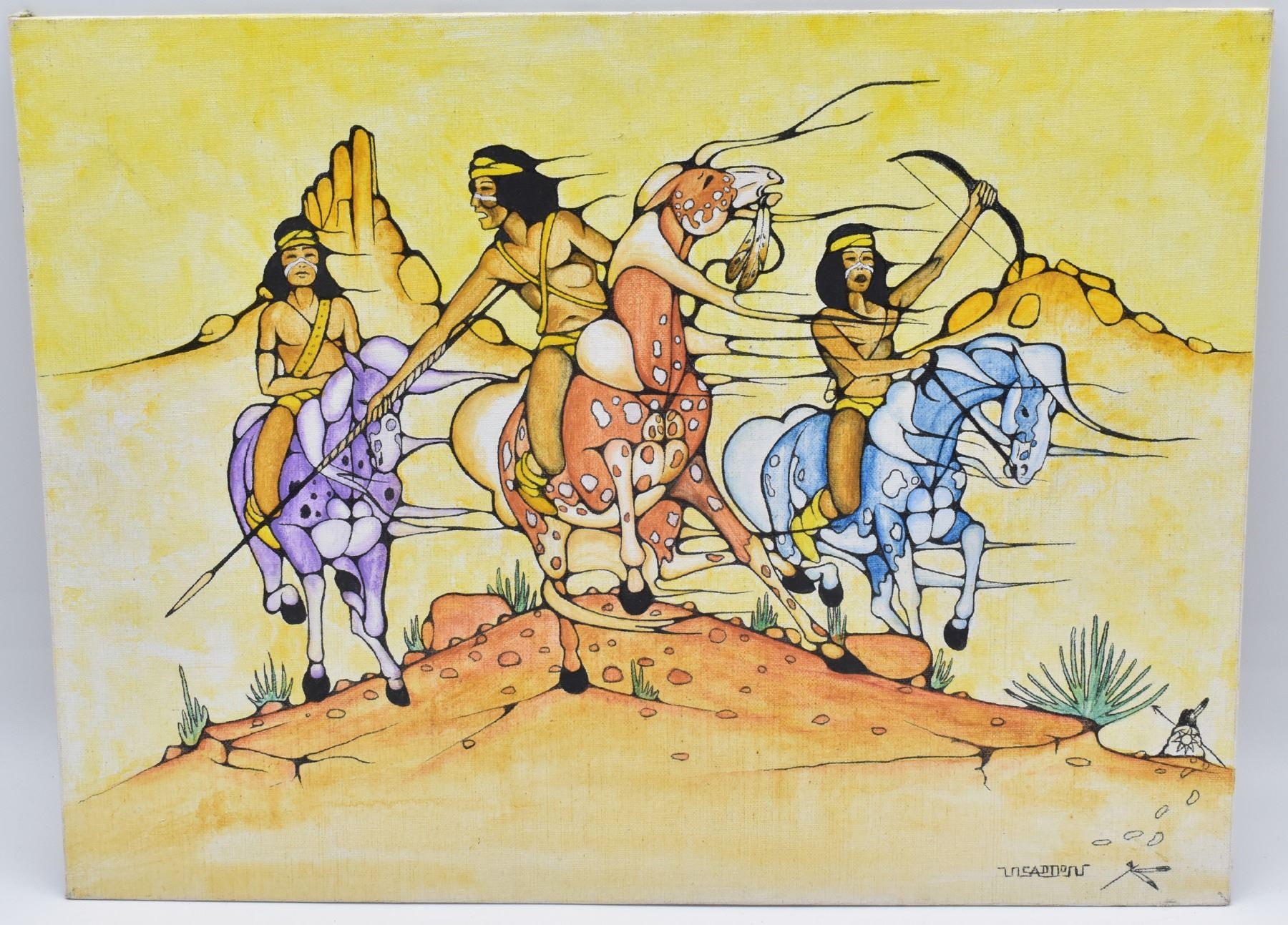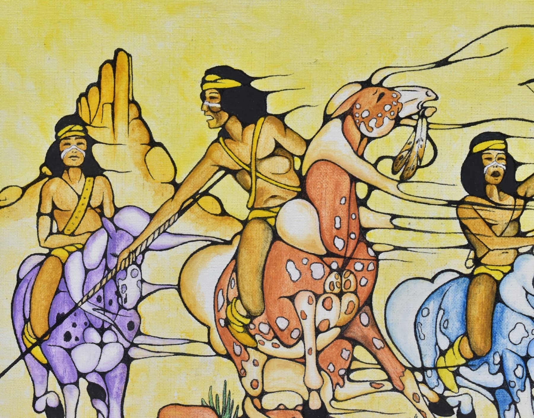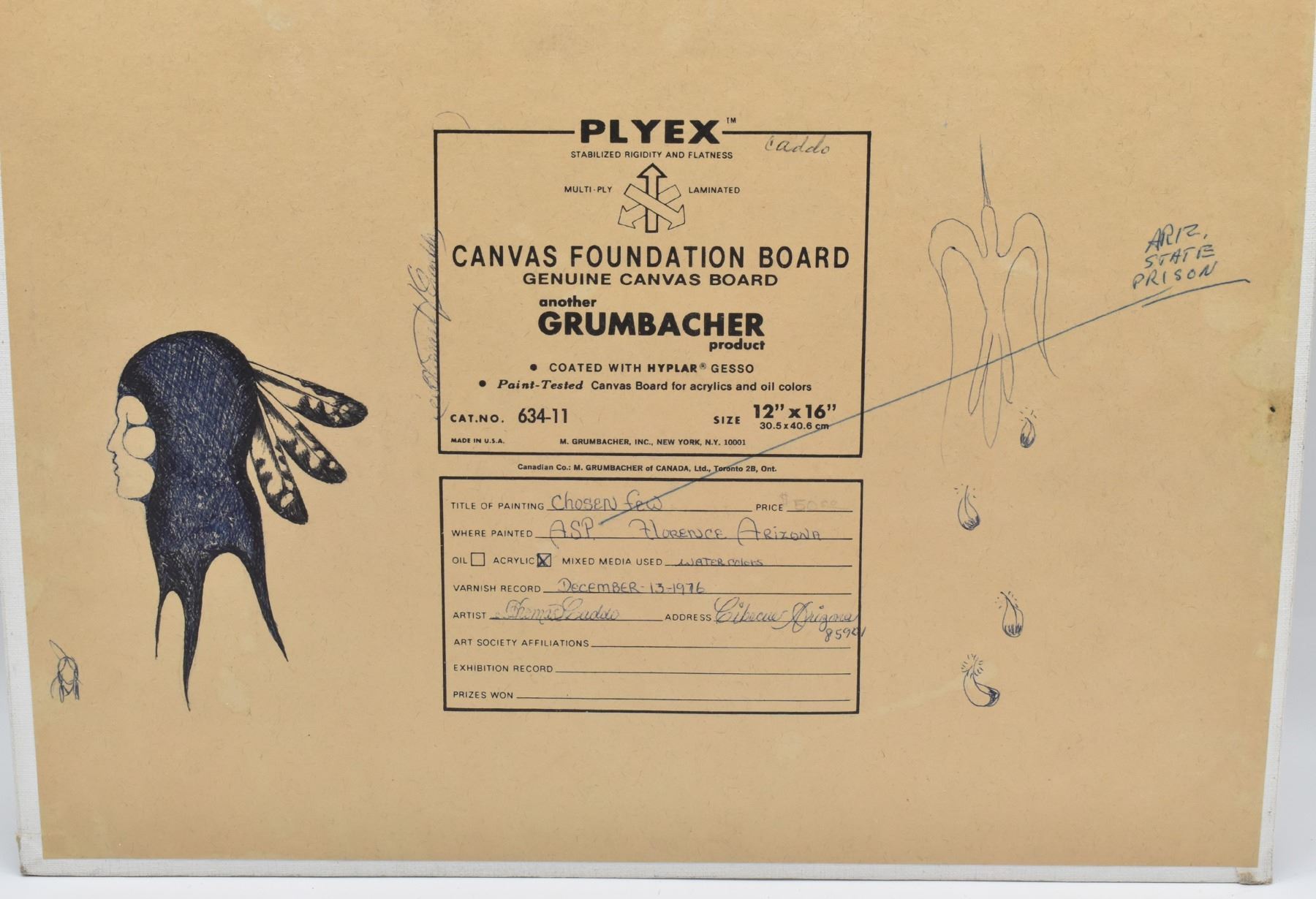 Original 1976 Native American Apache Acrylic and Watercolor Painting ''Chosen Few'' by Thomas Caddo of Cibecue AZ, on artist's board, this was painted while he was incarcerated at the Arizona State Prison in Florence AZ (as indicated on the back), signed on both the front and back