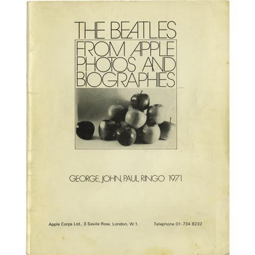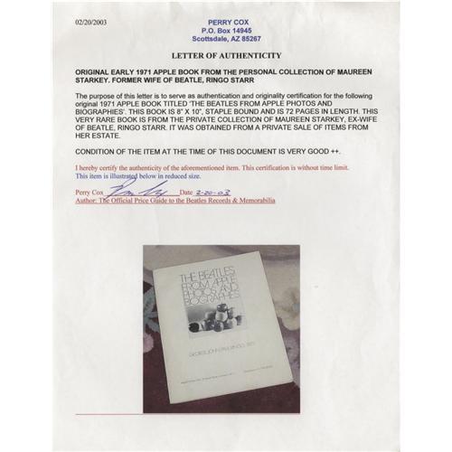 <B>Original Apple Book from Personal Collection of Maureen Starkey.</B></I> An original copy of <I>The Beatles From Apple Photos and Biographies</B></I> (1971), a complete history of the band and their catalog published by their label, staple-bound and 72 pages in length. This very rare book is from the private collection of Maureen Starkey, ex-wife of Ringo Starr.