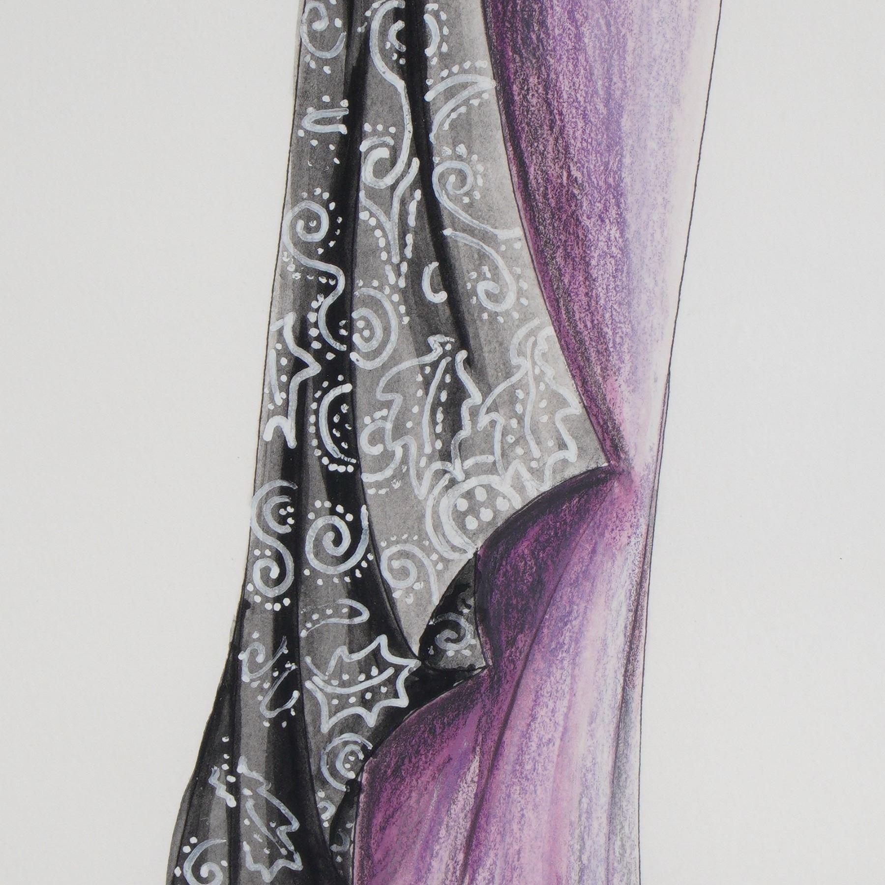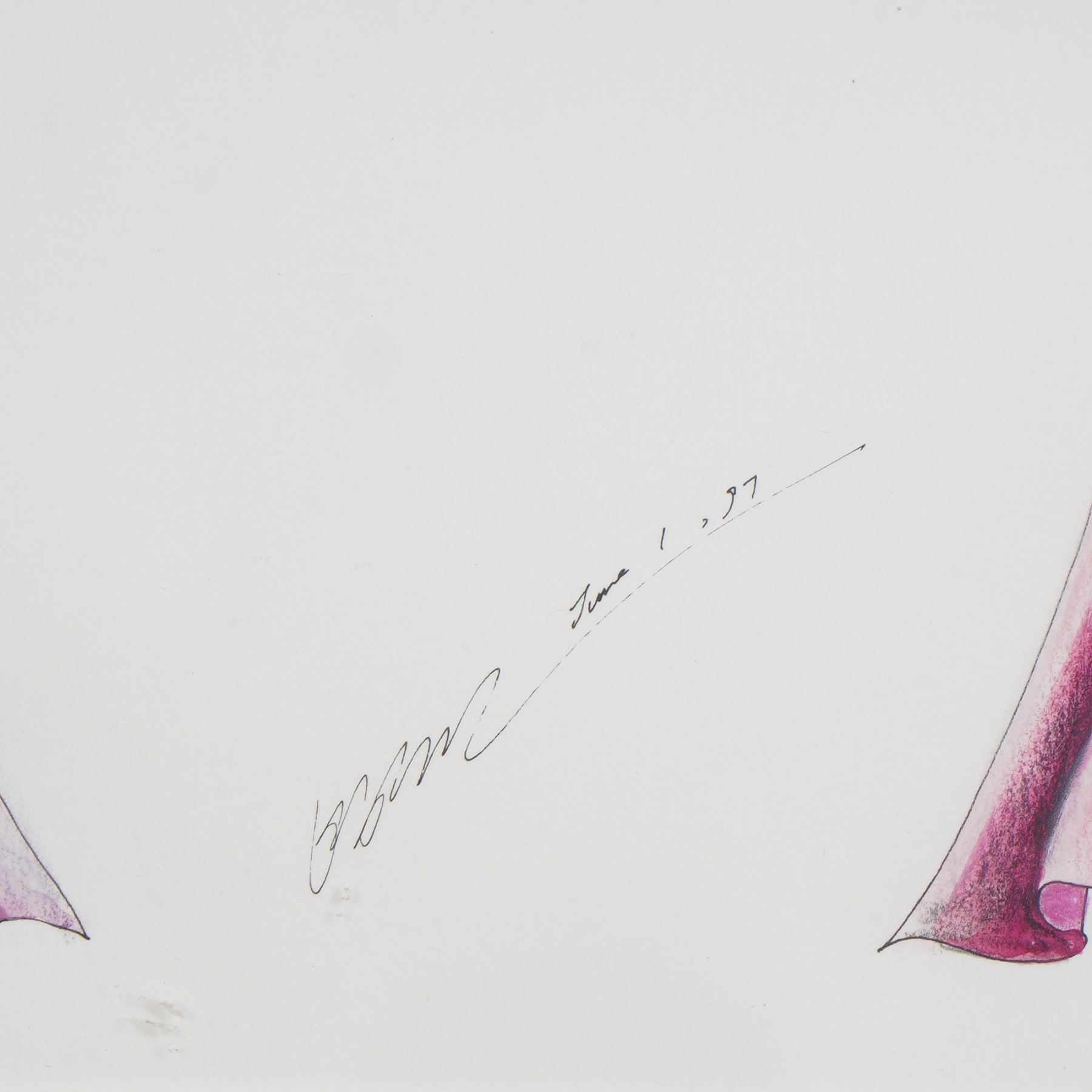 Striking original hand-drawn fashion illustration on paper depicting two mirrored female figures, each elegantly posed with bare backs and draped in flowing skirts of violet and magenta, accented by intricately patterned black and silver sashes. The figures are rendered with graceful Art Deco-inspired lines and stylized detail, joined at the fingertips in a balanced, symmetrical composition. Signed by the artist and dated June 1 1997, this work captures the sophistication and theatricality of high-fashion presentation during the late 20th century. Professionally framed and using archival museum-quality materials to preserve its vivid color and fine linework. A captivating addition for collectors of original fashion illustration and decorative art. Signed lower right.