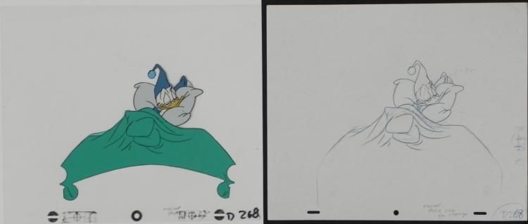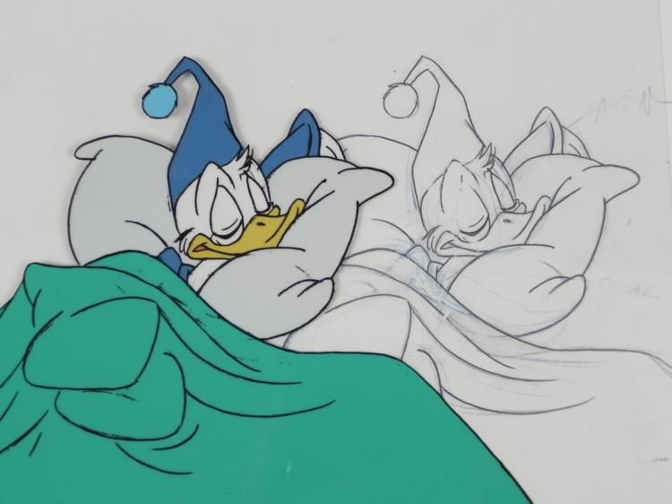 Here, it appears Donald Duck has passed out from a long day of hard work. This is an original animation cel from the production of Disney shows * Medium: Hand painted acetate cel with drawing * Size of cel: 10 1/2 x 12 1/2 inchesSize of drawing: 10 1/2 x 12 1/2 inches * Condition: Very goodDetails: Numbered on bottom rightDrawing Color: Blue and gray pencilThe cel received may be ever so slightly different than the one shown in the auction photo * *