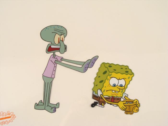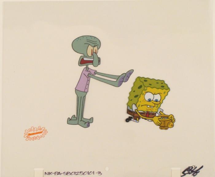 This original animation cel is from the Nickelodeon TV show SpongeBob Squarepants. The story takes place under the deep blue sea in Bikini Bottom, where SpongeBob resides. SpongeBob, who is a yellow, porous sponge, is your typical happy-go-lucky character, as he is always cheerful and enjoys making people laugh. Patrick Star, SpongeBob's neighbor who is a starfish, is your average children's show idiot, as he boasts knowing nothing and is often getting himself into ridiculous situations. Between the homes of these two lies the home of the miserable Squidward, a squid, who is known for being grouchy and playing tricks on SpongeBob and Patrick. Both SpongeBob and Squidward work at the Krusty Krab, a fast food business run by the greedy money-loving Mr. Krabs, a crab, the arch rival of the evil, possibly misunderstood, Plankton. Another neighbor, Sandy Cheeks, an athletic squirrel who normally wears an astronaut's space suit, was introduced in "Tea at the Treedome." She spends most of her time inventing and experimenting. Hold it right there Spongebob! What do you think you're doing?Original Production Animated Cel Overall Size of Cel: 10 1/2" x 12 1/2" Very Good ConditionThis is an original hand-painted cel set-up used in the production of an episode of "SpongeBob SquarePants." Each one-of-a-kind set-up represents a slight change in position of the characters. When individually photographed and projected in rapid succession, the images appear to move.