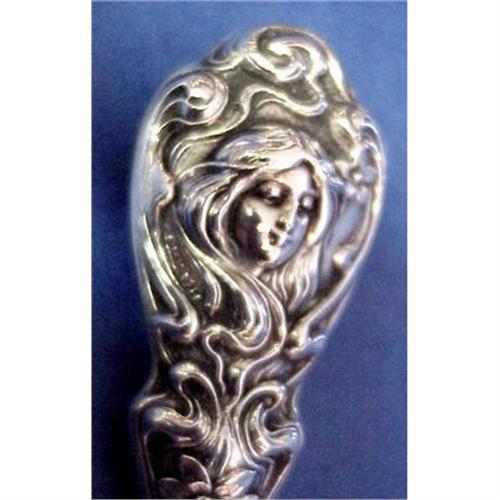 Gorgeous true , original , Art Nouveau nail tool - Made from sterling silver and depicting gorgeous Girl with flowing hair and beautiful flowers and flowing lines, this is true specimen of an Art Nouveau era - marked what i made out to be Sterling - very good condition, excellent sharpness of a lovely girls face , No dents or holes - Measures about 5" long and over 1" wide at the widest point - It is BEAUTIFUL! - U.S. buyer to pay 6.00 for ship. - Please pay via Paypal - Thank You