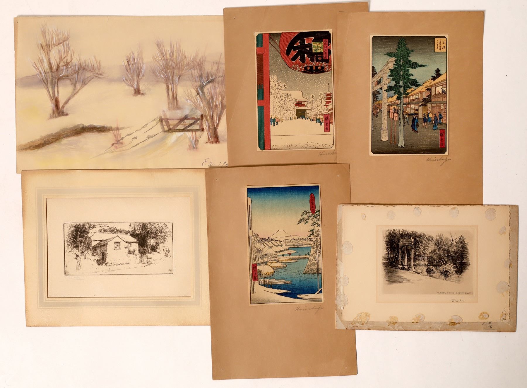 Lot of 6. Collection of penn and ink, watercolors. Two are marked Hiroshige possibly relating to Utagawa Hiroshima considered last great master of ukiyo-e-artist. Also. Paris park, pasture scene of trees signed E.W. 1942.