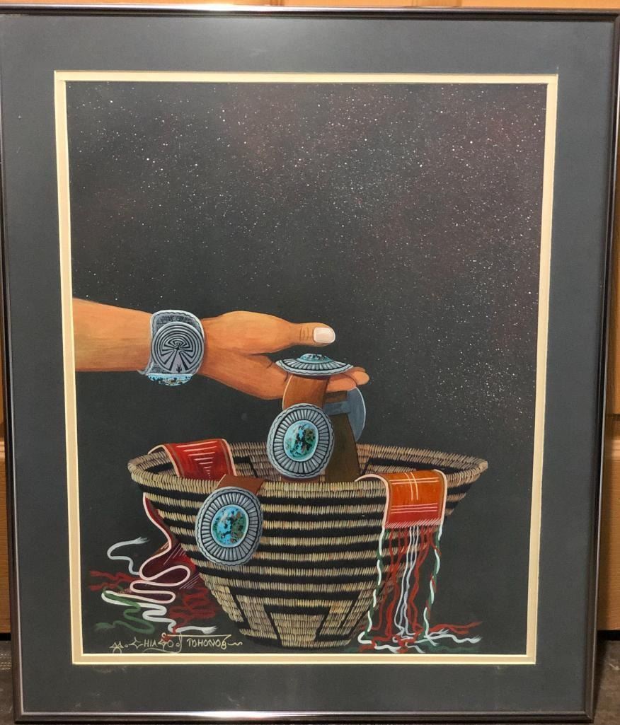 For sale in this lot is an original artwork featuring a Native American basket with turquoise jewelry by the well-known Tohono O'odham artist, Michael Chiago. Michael is a watercolor artist and illustrator who has been painting for over 40 years. He is famous for capturing the lives of O’Odham people in their natural state. He has traveled abroad to share his work and heritage with others. He has illustrated books, painted murals and has a permanent exhibit at the Heard Museum in Phoenix, Arizona. He has won numerous awards and participated in shows such as Indian Market and the Heard Museum Indian Fair. MAKER: Michael Chiago, Tohono O'Odham. APPROX AGE: Fairly contemporary. SIZE: 20-1/4 inches wide x 24-1/4 inches tall with frame. CONDITION: Good for its age, normal wear expected. Please look closely at the pictures as they are an important part of our description and are hereby incorporated into the description, specifically with regards to condition. SHIPPING: There will be a $25 handling / packaging fee for shipping this lot. The actual cost of postage will be added on top of that. BUY IT NOW: If you would like to buy this item now, without waiting for the auction day to bid on it, we do offer this option (which is available up to 48 hours before the actual auction starts). The “Buy it Now†price is the high estimate of this lot (plus applicable fees and the Buyer's premium is discounted to 10% when using the Buy it Now option). If you would like to exercise this option, you must contact us by email (or phone as long as you talk to someone live). Reference this lot number and your intention to "Buy it Now."