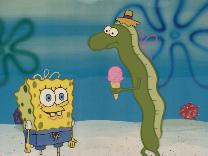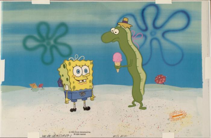 This animation cel and reproduction background are from the Nickelodeon TV show SpongeBob Squarepants. The story takes place under the deep blue sea in Bikini Bottom, where SpongeBob resides. SpongeBob, who is a yellow, porous sponge, is your typical happy-go-lucky character, as he is always cheerful and enjoys making people laugh. Patrick Star, SpongeBob's neighbor who is a starfish, is your average children's show idiot, as he boasts knowing nothing and is often getting himself into ridiculous situations. Between the homes of these two lies the home of the miserable Squidward, a squid, who is known for being grouchy and playing tricks on SpongeBob and Patrick. Both SpongeBob and Squidward work at the Krusty Krab, a fast food business run by the greedy money-loving Mr. Krabs, a crab, the arch rival of the evil, possibly misunderstood, Plankton. Another neighbor, Sandy Cheeks, an athletic squirrel who normally wears an astronaut's space suit, was introduced in "Tea at the Treedome." She spends most of her time inventing and experimenting. SpongeBob is at the beach.Original Printed Background and Animated Cel Overall Size of Background: 11" x 17" Overall Size of the Cel: 11" x 16 1/2" Very good condition This is an original hand-painted cel set-up used in the production of an episode of "SpongeBob SquarePants." Each one-of-a-kind set-up represents a slight change in position of the characters. When individually photographed and projected in rapid succession, the images appear to move.