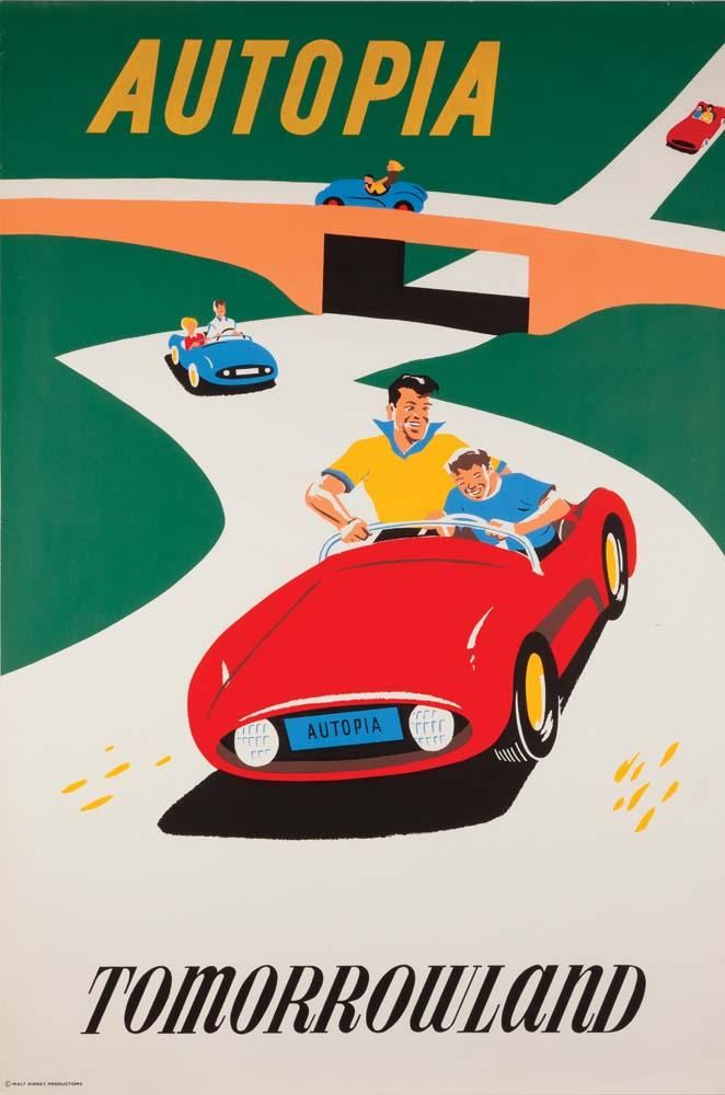 (Disneyland, 1955) A stunning original color poster for the Disneyland Autopia attraction. Measuring 36 x 54 in. with bright and vivid colors and striking imagery. In vintage fine condition.