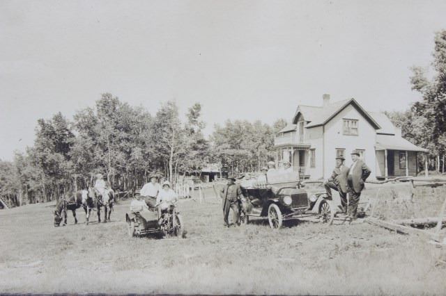 homestead near Bottineau ND. Fascinating image showing the good old days with family members, model T car, sidecar motorcycle and farm animals, in original frame, unmarked but includes history of the family.