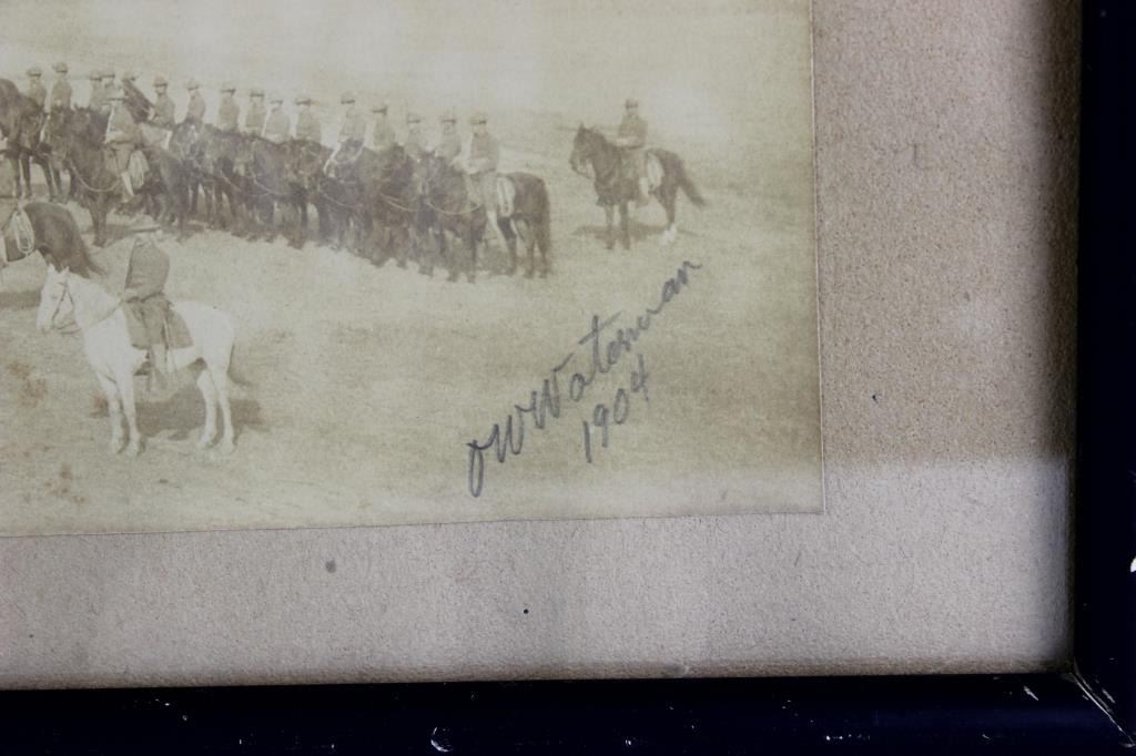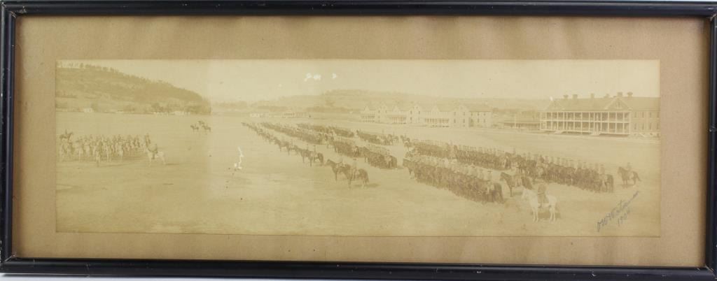 Original B&W panoramic of Ft. Meade SD depicting mounted soldiers in formation with the early barrack and building in background, signed and dated 1904, framed 9" X 13".depicting mounted soldiers in formation with the early barrack and building in background, signed and dated 1904, framed 9" X 13".