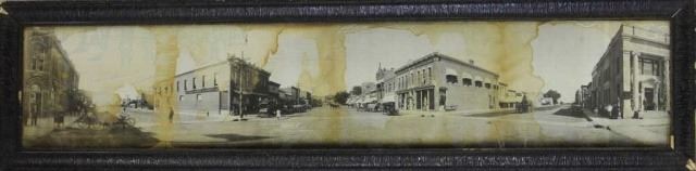 Original B&W panoramic of Pierre, SDmain street facing north. Photo dates post 1909 showing many of the early businesses including the 1st National Bank, Hilger and Hengel Clothing, Budweiser Saloon, Hatch and Fisher, Stopperan Lan Co. and probably themost interesting T.F. Riggs M.D. early doctor born to missionary parents of Dakota Territory in 1874, who opened his practice in 1909 after graduating John Hopkins medical school. Image shows moderate moisture damageand staining, regardless an uncommon historic view of early downtown Pierre SD., 9" X 46". From Gordon Campbell collection. Est. 300-600