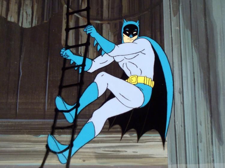 Batman is climbing a rope ladder. He is going to stop evil doers in Gotham City. * * * Original Production Background and Animated Cel Medium: Hand painted acetate cel Details: Numbers and peg holes * * Size of Background: 10 1/4 x 14 1/4 inches Size of Cel: 10 1/2 x 12 1/2 inches * * Condition: Very Good * * * This is an original hand-painted cel set-up used in the production of an episode of "Batman." Each one-of-a-kind set-up represents a slight change in position of the characters. When individually photographed and projected in rapid succession, the images * appear to move. * * To create production cels, the original animator's drawing is transferred onto an acetate cel (by hand-inking and/or photo copying). The cel is then hand-painted on the reverse side. The background accompanying this set-up is a hand-painted original production * background. *