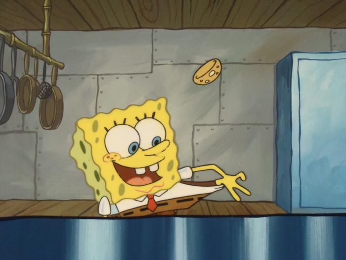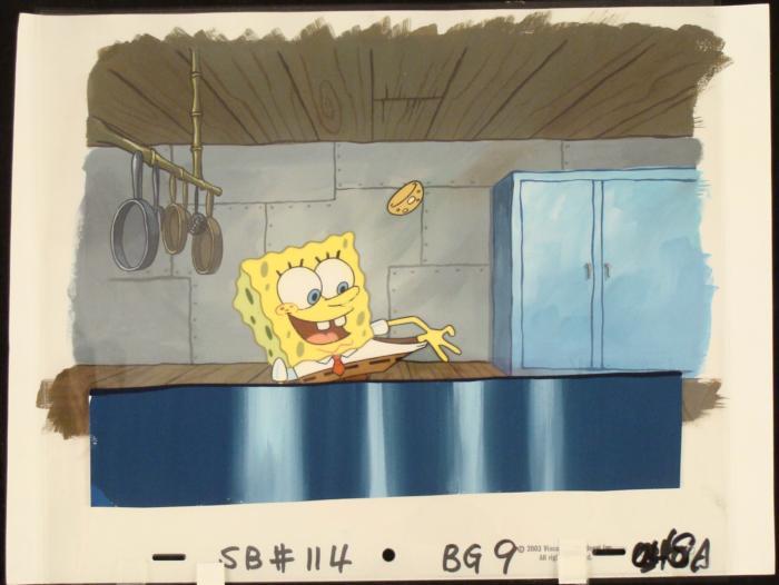 To create production cels, the original animator's drawing is transferred onto an acetate cel (by hand-inking and/or photo copying). The cel is then hand-painted on the reverse side. The background accompanying this set-up is a hand-painted original production background. The background is ready to be matted and framed. It is a colored background with a cel and has the animator's notations at the bottom of the background and the cel. The cel is multilayered: the first cel is a paper-cut out cel, the second cel is the the bun and the third cel is SpongeBob. There is some slight paint fade to SpongeBob's outline.