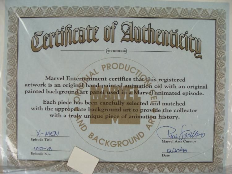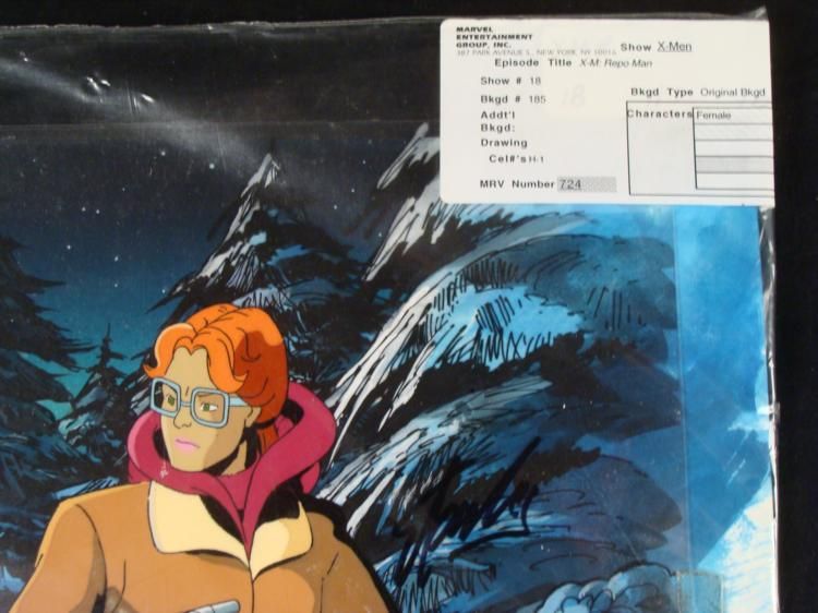This is an original signed production cel and background from the hit series X-Men. Stan Lee signature is located on the right of cel in black sharpie. * Under a cloud of increasing anti-mutant sentiment, Professor Xavier creates a haven at his Westchester mansion to train young mutants to use their powers for the benefit of humanity, and to prove mutants can be heroes. Xavier recruited Cyclops, Iceman, Angel, Beast and Jean Grey calling them "X-Men" because they possessed the "x-gene", an ability normal humans lacked. Early issues introduced the team's arch enemy, Magneto and his Brotherhood of Evil Mutants, who would later battle the X-Men for years. * I have a snazzy gun and I know how to use it... * * Original Animated Cel Overall Size of the Cel: 10 1/2" x 12 1/2" Overall Size of the background: 10 1/4" x 14 1/4" Excellent Condition This is an original hand-painted cel set-up used in the production of an episode of X-Men titled "Repo Man." Each one-of-a-kind set-up represents a slight change in position of the characters. When individually photographed and projected in rapid succession, the images appear to move. * To create production cels, the original animator's drawing is transferred onto an acetate cel (by hand-inking and/or photo copying). The cel is then hand-painted on the reverse side. The background accompanying this set-up is a original production background. * The cel and original background is ready to be matted and framed. The animators notations are located at the bottom of the cel and background. A certificate of Authenticity from Marvel is on the back of background. The Marvel Seal is located at the bottom right of the cel. The cel and background are in a protective sleeve An information card about the episode is located at the top right of the protective sleeve. *