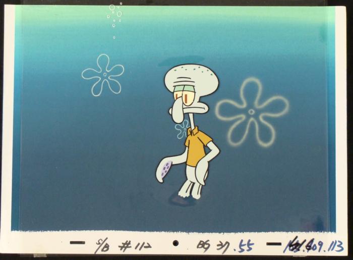 This original hand-painted background and animation cel are from the Nickelodeon TV show SpongeBob Squarepants. The story takes place under the deep blue sea in Bikini Bottom, where SpongeBob resides. SpongeBob, who is a yellow, porous sponge, is your typical happy-go-lucky character, as he is always cheerful and enjoys making people laugh. Patrick Star, SpongeBob's neighbor who is a starfish, is your average children's show idiot, as he boasts knowing nothing and is often getting himself into ridiculous situations. Between the homes of these two lies the home of the miserable Squidward, a squid, who is known for being grouchy and playing tricks on SpongeBob and Patrick. Both SpongeBob and Squidward work at the Krusty Krab, a fast food business run by the greedy money-loving Mr. Krabs, a crab, the arch rival of the evil, possibly misunderstood, Plankton. Another neighbor, Sandy Cheeks, an athletic squirrel who normally wears an astronaut's space suit, was introduced in "Tea at the Treedome." She spends most of her time inventing and experimenting. Squidward is wearing his brown shirt.Original Production Background and Animated Cel Overall Size of Background: 10 1/2" x 14" Overall Size of the Cel: 10 1/2" x 12 1/2" Very good condition This is an original hand-painted cel set-up used in the production of an episode of "SpongeBob SquarePants." Each one-of-a-kind set-up represents a slight change in position of the characters. When individually photographed and projected in rapid succession, the images appear to move.