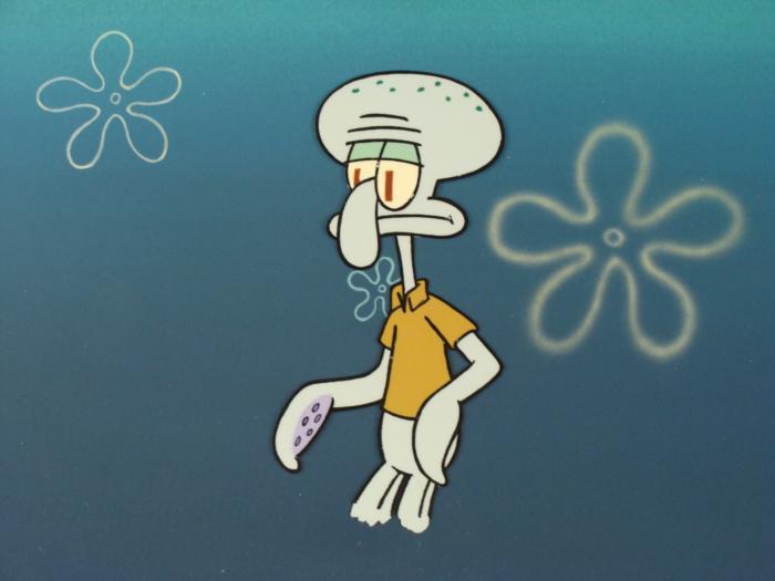 This original hand-painted background and animation cel are from the Nickelodeon TV show SpongeBob Squarepants. The story takes place under the deep blue sea in Bikini Bottom, where SpongeBob resides. SpongeBob, who is a yellow, porous sponge, is your typical happy-go-lucky character, as he is always cheerful and enjoys making people laugh. Patrick Star, SpongeBob's neighbor who is a starfish, is your average children's show idiot, as he boasts knowing nothing and is often getting himself into ridiculous situations. Between the homes of these two lies the home of the miserable Squidward, a squid, who is known for being grouchy and playing tricks on SpongeBob and Patrick. Both SpongeBob and Squidward work at the Krusty Krab, a fast food business run by the greedy money-loving Mr. Krabs, a crab, the arch rival of the evil, possibly misunderstood, Plankton. Another neighbor, Sandy Cheeks, an athletic squirrel who normally wears an astronaut's space suit, was introduced in "Tea at the Treedome." She spends most of her time inventing and experimenting. Squidward is wearing his brown shirt.Original Production Background and Animated Cel Overall Size of Background: 10 1/2" x 14" Overall Size of the Cel: 10 1/2" x 12 1/2" Very good condition This is an original hand-painted cel set-up used in the production of an episode of "SpongeBob SquarePants." Each one-of-a-kind set-up represents a slight change in position of the characters. When individually photographed and projected in rapid succession, the images appear to move.