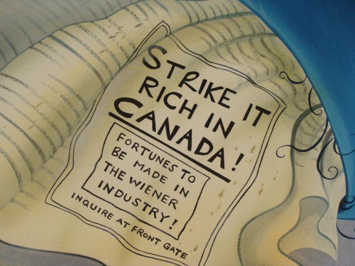 This original hand-painted background is from the Nickelodeon TV show Ren & Stimpy. The show follows two characters - Ren, a crazy Chihuahua - and - Stimpy, an incredibly stupid cat - as they think up to all kinds of hair brained schemes and get themselves into some sticky situations. The Ren and Stimpy Show debuted in August 1991 with a two-part episode, 'Stimpy's Big Day / The Big Shot' and became an instant hit. It was the third Nicktoon ever to be aired on the Network alongside Doug and Rugrats. "Strike it Rich in Canada! Fortunes to be made in the wiener industry! Inquire at the front gate"Original Production Background Overall Size: 10" x 13" Excellent condition Original Production Backgrounds are used in the making of the final version of animated productions. The background establishes the location and the overall good mood of the scenee. Typically, a background layout artist creates a drawing to establish the content of the scene, placement of characters, perspective and camera angle. Based on this drawing, the background artist creates a preliminary painting to confirm all of the scenes details, then the final production background which is used in the filming of the scene. When these backgrounds are individually photographed behind the progression of production cels, and projected at a rapid succession, the images in the foreground appear to move, creating an animated scene. The background is to be matted and framed. It is a colored background with the animator's notations shown at the bottom.