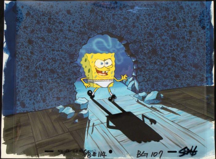 To create production cels, the original animator's drawing is transferred onto an acetate cel (by hand-inking and/or photo copying). The cel is then hand-painted on the reverse side. The background accompanying this set-up is a hand-painted original production background. The background is ready to be matted and framed. It is a colored background with a cel and has the animator's notations at the bottom of both. The cel is multilayered: the first cel is Spongebob and next is his shadow. There is some paint Spongebob's outline and some paint residue on the second cel.