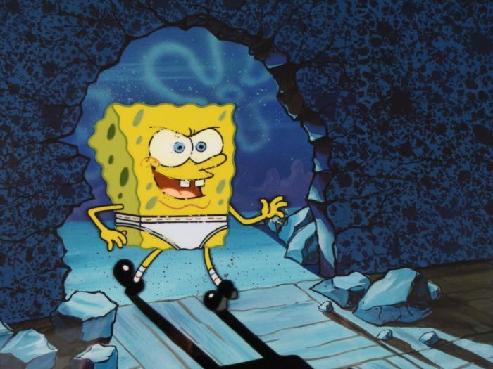 This original hand-painted background and animation cel are from the Nickelodeon TV show SpongeBob Squarepants. The story takes place under the deep blue sea in Bikini Bottom, where SpongeBob resides. SpongeBob, who is a yellow, porous sponge, is your typical happy-go-lucky character, as he is always cheerful and enjoys making people laugh. Patrick Star, SpongeBob's neighbor who is a starfish, is your average children's show idiot, as he boasts knowing nothing and is often getting himself into ridiculous situations. Between the homes of these two lies the home of the miserable Squidward, a squid, who is known for being grouchy and playing tricks on SpongeBob and Patrick. Both SpongeBob and Squidward work at the Krusty Krab, a fast food business run by the greedy money-loving Mr. Krabs, a crab, the arch rival of the evil, possibly misunderstood, Plankton. Another neighbor, Sandy Cheeks, an athletic squirrel who normally wears an astronaut's space suit, was introduced in "Tea at the Treedome." She spends most of her time inventing and experimenting. See ya!!! Catch you on the "flip side."Original Production Background and Animated Cel Overall Size of Background: 10 1/2" x 14" Overall Size of the Cels: 10 1/2" x 12 1/2" Very good condition This is an original hand-painted cel set-up used in the production of an episode of "SpongeBob SquarePants." Each one-of-a-kind set-up represents a slight change in position of the characters. When individually photographed and projected in rapid succession, the images appear to move.