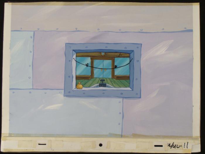 This original hand-painted background and animation cel are from the Nickelodeon TV show SpongeBob Squarepants. The story takes place under the deep blue sea in Bikini Bottom, where SpongeBob resides. SpongeBob, who is a yellow, porous sponge, is your typical happy-go-lucky character, as he is always cheerful and enjoys making people laugh. Patrick Star, SpongeBob's neighbor, boasts knowing nothing and is often getting himself into ridiculous situations. Between the homes of these two lies the home of the miserable Squidward, a squid, who is known for being grouchy and playing tricks on SpongeBob and Patrick. Both SpongeBob and Squidward work at the Krusty Krab, a fast food business run by the greedy money-loving Mr. Krabs, a crab, the arch rival of the evil, possibly misunderstood, Plankton. Another neighbor, Sandy Cheeks, an athletic squirrel who normally wears an astronaut's space suit, was introduced in "Tea at the Treedome." She spends most of her time inventing and experimenting. This is a view from the kitchen through the order window, which is what Spongebob sees when he is at work at the Krusty Krab.Original Production Background and Animated Cel Overall Size of Background: 10 1/2" x 13 1/4" Overall Size of the Cel: 2 1/2" x 3 3/4" Very good condition; it has been stored This is an original hand-painted cel set-up used in the production of an episode of "SpongeBob SquarePants." Each one-of-a-kind set-up represents a slight change in position of the characters. When individually photographed and projected in rapid succession, the images appear to move.