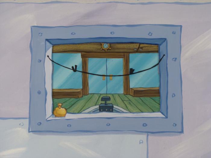 This original hand-painted background and animation cel are from the Nickelodeon TV show SpongeBob Squarepants. The story takes place under the deep blue sea in Bikini Bottom, where SpongeBob resides. SpongeBob, who is a yellow, porous sponge, is your typical happy-go-lucky character, as he is always cheerful and enjoys making people laugh. Patrick Star, SpongeBob's neighbor, boasts knowing nothing and is often getting himself into ridiculous situations. Between the homes of these two lies the home of the miserable Squidward, a squid, who is known for being grouchy and playing tricks on SpongeBob and Patrick. Both SpongeBob and Squidward work at the Krusty Krab, a fast food business run by the greedy money-loving Mr. Krabs, a crab, the arch rival of the evil, possibly misunderstood, Plankton. Another neighbor, Sandy Cheeks, an athletic squirrel who normally wears an astronaut's space suit, was introduced in "Tea at the Treedome." She spends most of her time inventing and experimenting. This is a view from the kitchen through the order window, which is what Spongebob sees when he is at work at the Krusty Krab.Original Production Background and Animated Cel Overall Size of Background: 10 1/2" x 13 1/4" Overall Size of the Cel: 2 1/2" x 3 3/4" Very good condition; it has been stored This is an original hand-painted cel set-up used in the production of an episode of "SpongeBob SquarePants." Each one-of-a-kind set-up represents a slight change in position of the characters. When individually photographed and projected in rapid succession, the images appear to move.