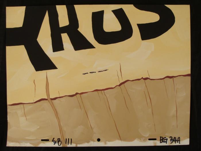 This original hand-painted background from the Nickelodeon TV show SpongeBob Squarepants. The story takes place under the deep blue sea in Bikini Bottom, where SpongeBob resides. SpongeBob, who is a yellow, porous sponge, is your typical happy-go-lucky character, as he is always cheerful and enjoys making people laugh. Patrick Star, SpongeBob's neighbor who is a starfish, is your average children's show idiot, as he boasts knowing nothing and is often getting himself into ridiculous situations. Between the homes of these two lies the home of the miserable Squidward, a squid, who is known for being grouchy and playing tricks on SpongeBob and Patrick. Both SpongeBob and Squidward work at the Krusty Krab, a fast food business run by the greedy money-loving Mr. Krabs, a crab, the arch rival of the evil, possibly misunderstood, Plankton. Another neighbor, Sandy Cheeks, an athletic squirrel who normally wears an astronaut's space suit, was introduced in "Tea at the Treedome." She spends most of her time inventing and experimenting. Read the fine print!!!Original Production Background Overall Size of Background: 10 1/2" x 13 3/4" Very good condition; it has been storedOriginal Production Backgrounds are used in the making of the final version of animated productions. The background establishes the location and the overall good mood of the scenee. Typically, a background layout artist creates a drawing to establish the content of the scene, placement of characters, perspective and camera angle. Based on this drawing, the background artist creates a preliminary painting to confirm all of the scenes details, then the final production background which is used in the filming of the scene. When these backgrounds are individually photographed behind the progression of production cels, and projected at a rapid succession, the images in the foreground appear to move, creating an animated scene. The background is ready to be matted and framed. It is a colored background with the animator's notations at the bottom.