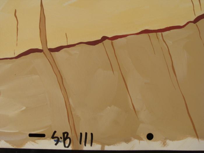 This original hand-painted background from the Nickelodeon TV show SpongeBob Squarepants. The story takes place under the deep blue sea in Bikini Bottom, where SpongeBob resides. SpongeBob, who is a yellow, porous sponge, is your typical happy-go-lucky character, as he is always cheerful and enjoys making people laugh. Patrick Star, SpongeBob's neighbor who is a starfish, is your average children's show idiot, as he boasts knowing nothing and is often getting himself into ridiculous situations. Between the homes of these two lies the home of the miserable Squidward, a squid, who is known for being grouchy and playing tricks on SpongeBob and Patrick. Both SpongeBob and Squidward work at the Krusty Krab, a fast food business run by the greedy money-loving Mr. Krabs, a crab, the arch rival of the evil, possibly misunderstood, Plankton. Another neighbor, Sandy Cheeks, an athletic squirrel who normally wears an astronaut's space suit, was introduced in "Tea at the Treedome." She spends most of her time inventing and experimenting. Read the fine print!!!Original Production Background Overall Size of Background: 10 1/2" x 13 3/4" Very good condition; it has been storedOriginal Production Backgrounds are used in the making of the final version of animated productions. The background establishes the location and the overall good mood of the scenee. Typically, a background layout artist creates a drawing to establish the content of the scene, placement of characters, perspective and camera angle. Based on this drawing, the background artist creates a preliminary painting to confirm all of the scenes details, then the final production background which is used in the filming of the scene. When these backgrounds are individually photographed behind the progression of production cels, and projected at a rapid succession, the images in the foreground appear to move, creating an animated scene. The background is ready to be matted and framed. It is a colored background with the animator's notations at the bottom.