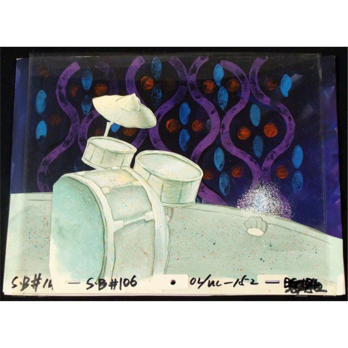 Normal 0 false false false MicrosoftInternetExplorer4 /* Style Definitions */ table.MsoNormalTable{mso-style-name:"Table Normal";mso-tstyle-rowband-size:0;mso-tstyle-colband-size:0;mso-style-noshow:yes;mso-style-parent:"";mso-padding-alt:0in 5.4pt 0in 5.4pt;mso-para-margin:0in;mso-para-margin-bottom:.0001pt;mso-pagination:widow-orphan;font-size:10.0pt;font-family:"Times New Roman";mso-ansi-language:#0400;mso-fareast-language:#0400;mso-bidi-language:#0400;}This original hand-painted background is from the Nickelodeon TVshow SpongeBob Squarepants. The story takes place under the deepblue sea in Bikini Bottom, where SpongeBob resides. SpongeBob, who is ayellow, porous sponge, is your typical happy-go-lucky character, as he isalways cheerful and enjoys making people laugh. Patrick Star, SpongeBob's neighborwho is a starfish, is your average children's show idiot, as he boasts knowingnothing and is often getting himself into ridiculous situations. Between thehomes of these two lies the home of the miserable Squidward, a squid, who isknown for being grouchy and playing tricks on SpongeBob and Patrick. BothSpongeBob and Squidward work at the Krusty Krab, a fast food business run bythe greedy money-loving Mr. Krabs, a crab, the arch rival of the evil, possiblymisunderstood, Plankton. Another neighbor, Sandy Cheeks, an athletic squirrelwho normally wears an astronaut's space suit, was introduced in "Tea atthe Treedome." She spends most of her time inventing and experimenting. * Who says you can't rock out in sand?!?!? * * Normal 0 false false false MicrosoftInternetExplorer4 /* Style Definitions */ table.MsoNormalTable{mso-style-name:"Table Normal";mso-tstyle-rowband-size:0;mso-tstyle-colband-size:0;mso-style-noshow:yes;mso-style-parent:"";mso-padding-alt:0in 5.4pt 0in 5.4pt;mso-para-margin:0in;mso-para-margin-bottom:.0001pt;mso-pagination:widow-orphan;font-size:10.0pt;font-family:"Times New Roman";mso-ansi-language:#0400;mso-fareast-language:#0400;mso-bidi-language:#0400;}Original Production Background and Animated Cel Overall Size of Background: 10 1/2" x 13 1/2" Overall Size of the Cels: 10 1/2" x 12 1/2" Very good condition; it has been stored This is an original hand-painted cel set-up used in the productionof an episode of "SpongeBob SquarePants." Each one-of-a-kind set-uprepresents a slight change in position of the characters. When individuallyphotographed and projected in rapid succession, the images appear to move. * To create production cels, the original animator's drawing is transferred ontoan acetate cel (by hand-inking and/or photo copying). The cel is thenhand-painted on the reverse side. The background accompanying this set-upis a hand-painted original production background. * The background and cel are ready to be matted and framed. Itis a colored background with a cel and has the animator'snotations at the bottom of both. *