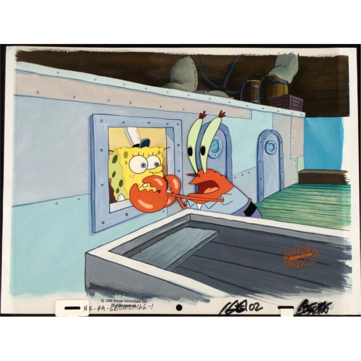 This original animation cel and background are from the Nickelodeon TV show SpongeBob Squarepants, from the episode titled "Squeaky Boots". The story takes place under the deep blue sea in Bikini Bottom, where SpongeBob resides. SpongeBob, who is a yellow, porous sponge, is your typical happy-go-lucky character, as he is always cheerful and enjoys making people laugh. Patrick Star, SpongeBob's neighbor who is a starfish, is your average children's show idiot, as he boasts knowing nothing and is often getting himself into ridiculous situations. Between the homes of these two lies the home of the miserable Squidward, a squid, who is known for being grouchy and playing tricks on SpongeBob and Patrick. Both SpongeBob and Squidward work at the Krusty Krab, a fast food business run by the greedy money-loving Mr. Krabs, a crab, the arch rival of the evil, possibly misunderstood, Plankton. Another neighbor, Sandy Cheeks, an athletic squirrel who normally wears an astronaut's space suit, was introduced in "Tea at the Treedome." She spends most of her time inventing and experimenting. * Spongebob, what are we going to do? What are we going to DO??? * Original Printed Background and Animated Cel Overall Size of Background: 10 1/4" x 13 1/2" Overall Size of the Cel: 10 1/2" x 12 1/2" Very Good condition This is an original hand-painted cel set-up used in the production of an episode of "SpongeBob SquarePants." Each one-of-a-kind set-up represents a slight change in position of the characters. When individually photographed and projected in rapid succession, the images appear to move. * To create production cels, the original animator's drawing is transferred onto an acetate cel (by hand-inking and/or photo copying). The cel is then hand-painted on the reverse side. The background accompanying this set-up is a hand-painted original production background. * This original background and cel are ready to be matted and framed. The notations are located at the bottom of both. The Nickelodeon logo is located at the bottom right of the first cel. The cel is multi-layered: first is Mr. Krabs and then Spongebob. There is some paint residue on the second cel. *