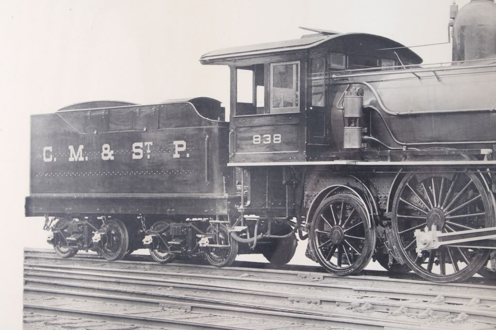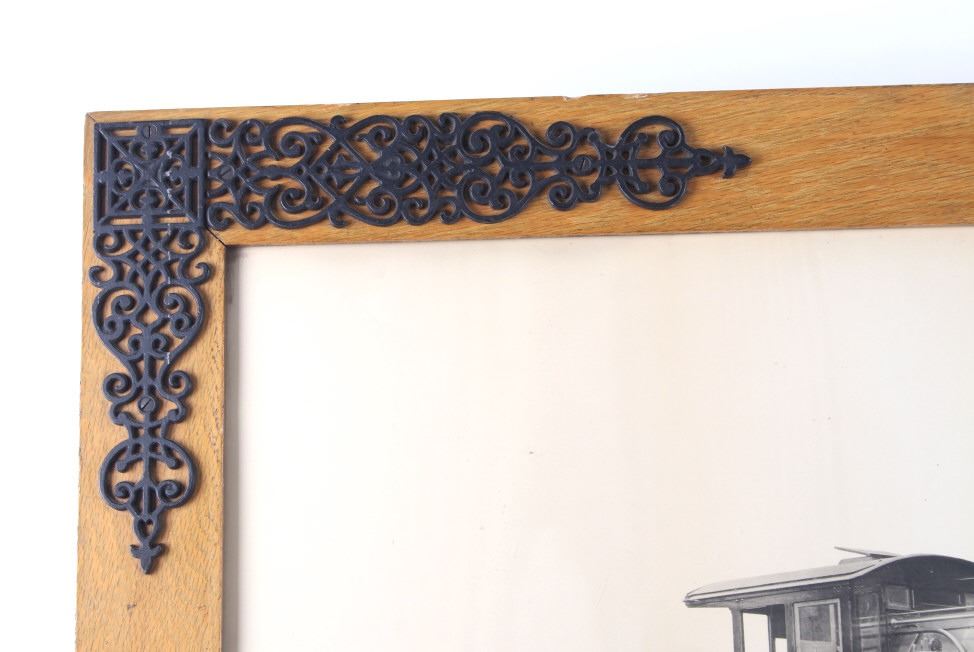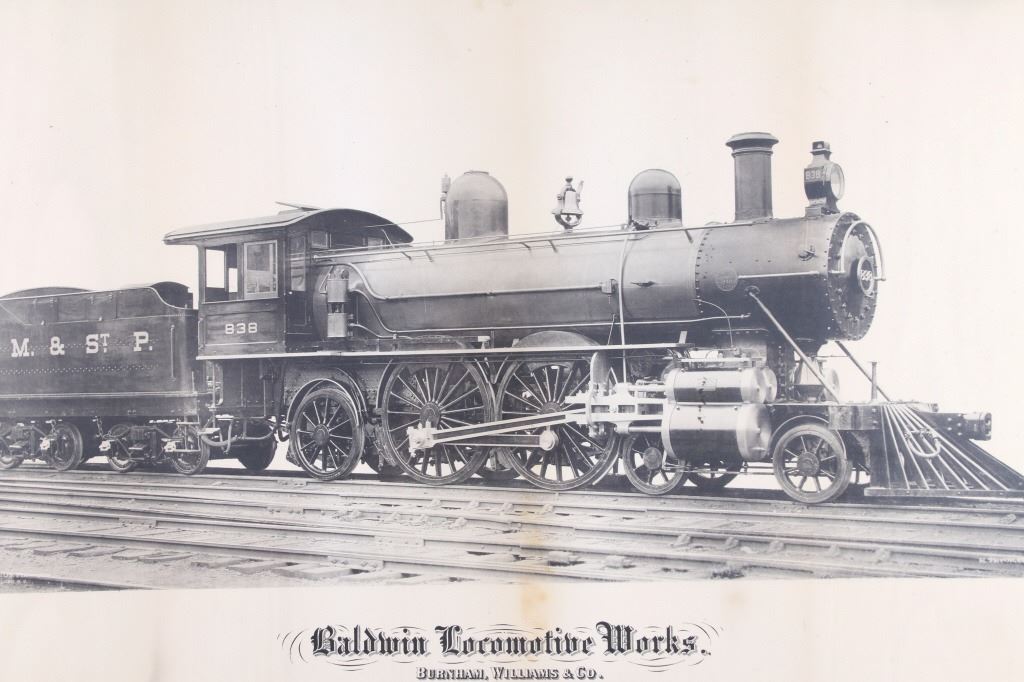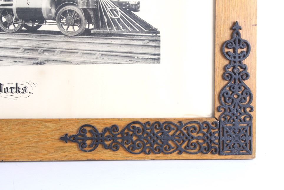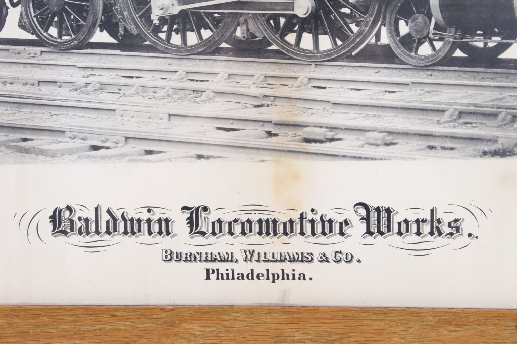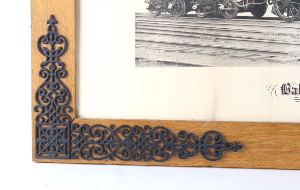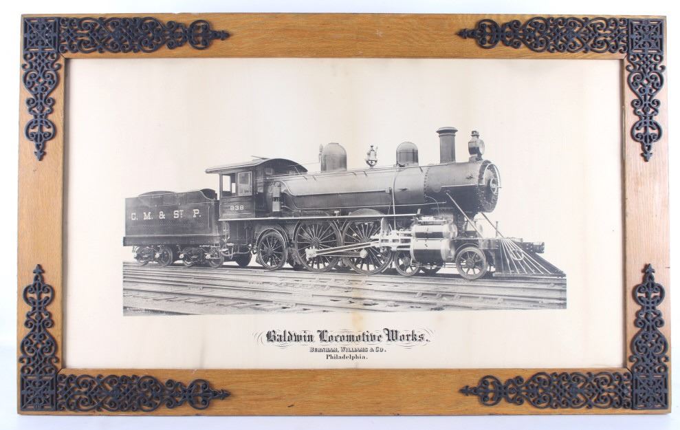 Featured in this lot is this original Baldwin Locomotive Works framed advertisement. The advertisement shows a wonderfully and professionally crafted quarter sawn oak construction to the frame with a beautiful corner play of wrought iron decoration in a lattice style. The advertisement shows a nine wheel locomotive began in 1851 and finished in 1855 and reads C. M. & ST. P 838. The advertisement reads: Baldwin Locomotive Works - Burnham, WIlliams & Co. - Philadelphia. Baldwin Locomotive Works of Philadelphia, Pennsylvania was the most successful builder of locomotives in the world. The company was founded by Matthias W. Baldwin, who was a jeweler before he began producing steam engines for locomotives in 1832. The condition of this this framed advertisement is good with no obvious signs of damage and in good overall condition. The measurements of this framed advertisement is 25 1/4" x 41".