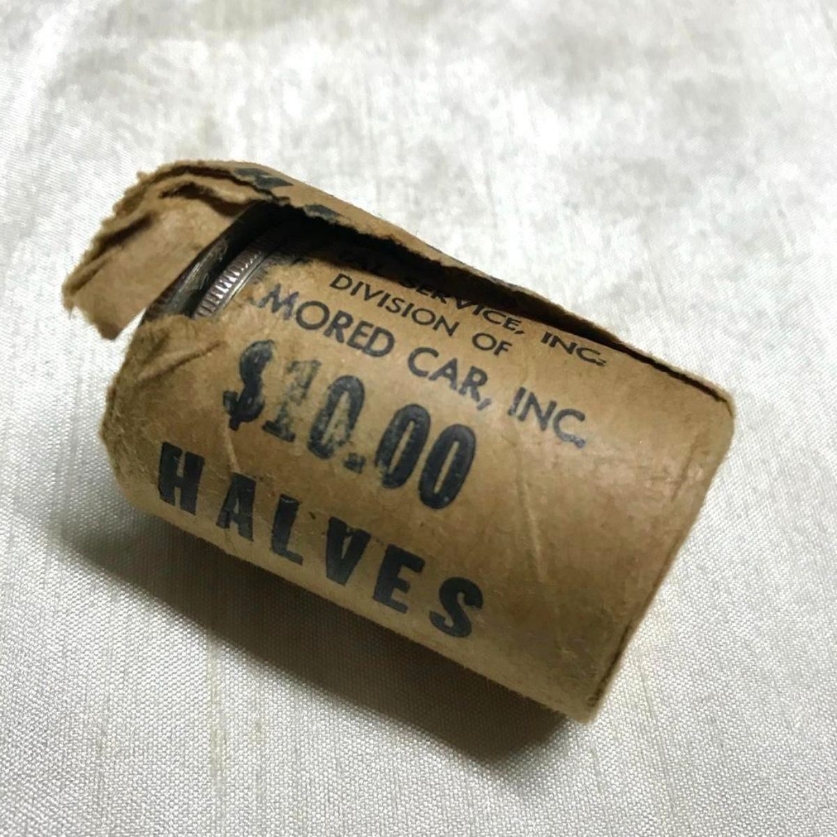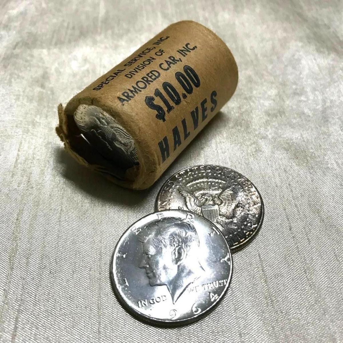 Original bankroll of $10 in uncirculated 1964 Kennedy half-dollar, fifty-cent coins. 20 total. 90% silver coins. Bankroll wrapping reads "Special Service, Inc. Division of Armored Car, Inc. $10 Halves". Recently discovered in a safe in Mississippi. * coins removed from roll for photo purposes only. * the two coins on each end show some tarnish on sides that faced out.Â
