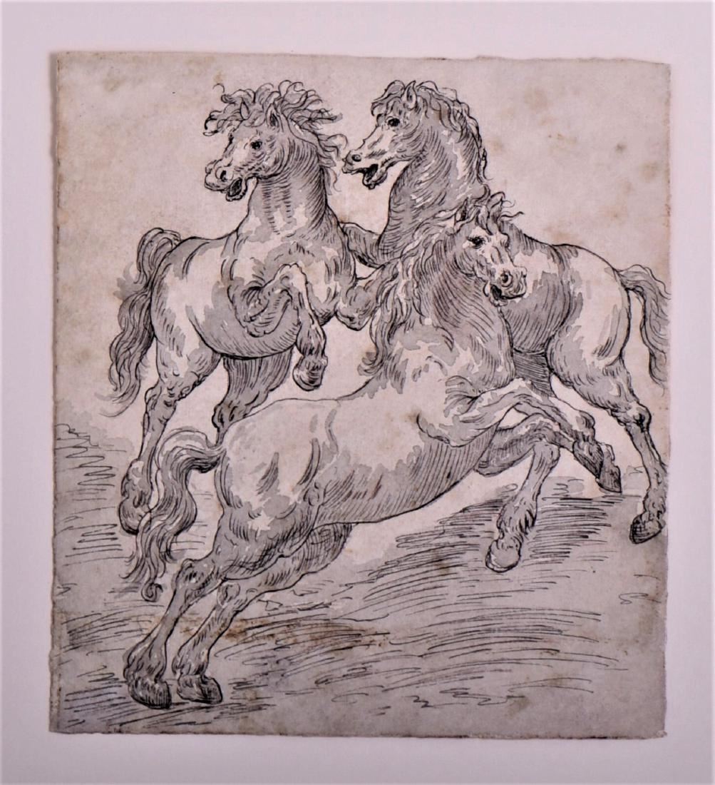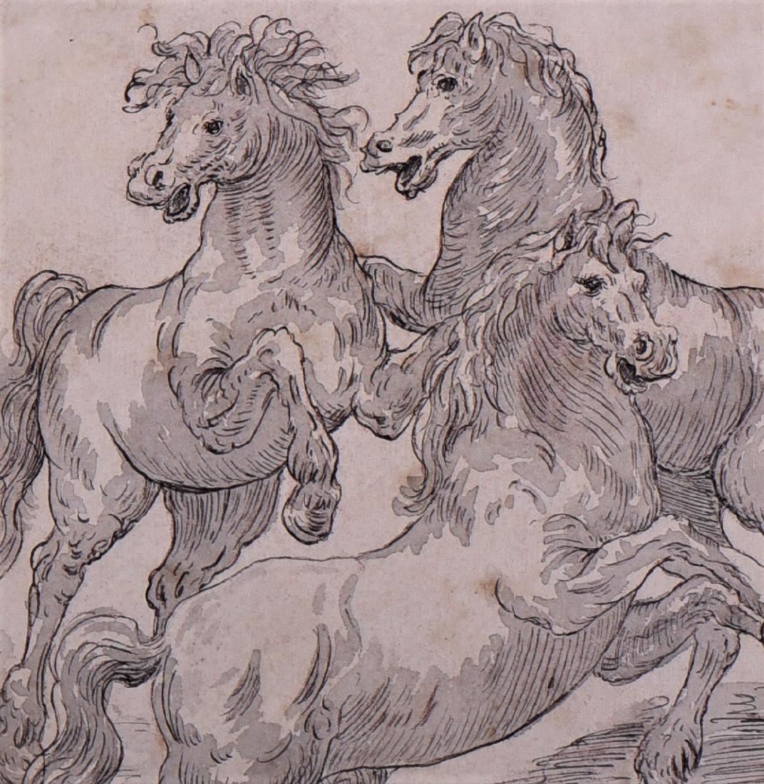 Original Baroque Master Drawing of Wild Stallions, 1600s on hand made Washi paper.