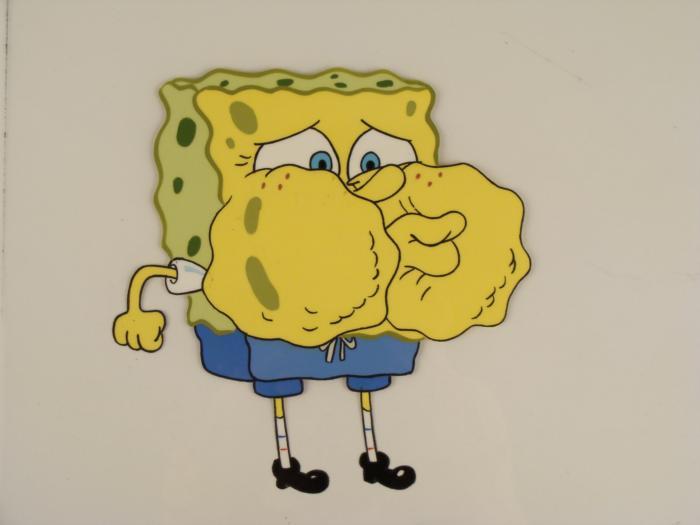 This original animation cel is from the Nickelodeon TV show SpongeBob Squarepants. The story takes place under the deep blue sea in Bikini Bottom, where SpongeBob resides. SpongeBob, who is a yellow, porous sponge, is your typical happy-go-lucky character, as he is always cheerful and enjoys making people laugh. Patrick Star, SpongeBob's neighbor who is a starfish, is your average children's show idiot, as he boasts knowing nothing and is often getting himself into ridiculous situations. Between the homes of these two lies the home of the miserable Squidward, a squid, who is known for being grouchy and playing tricks on SpongeBob and Patrick. Both SpongeBob and Squidward work at the Krusty Krab, a fast food business run by the greedy money-loving Mr. Krabs, a crab, the arch rival of the evil, possibly misunderstood, Plankton. Another neighbor, Sandy Cheeks, an athletic squirrel who normally wears an astronaut's space suit, was introduced in "Tea at the Treedome." She spends most of her time inventing and experimenting. Be careful Spongebob, don't hold your breath too long...Original Production Animated Cel Overall Size of Cel: 10 1/2" x 12 1/2" Excellent ConditionThis is an original hand-painted cel set-up used in the production of an episode of "SpongeBob SquarePants." Each one-of-a-kind set-up represents a slight change in position of the characters. When individually photographed and projected in rapid succession, the images appear to move.