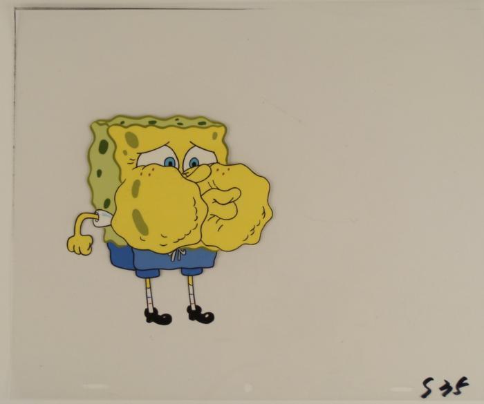 This original animation cel is from the Nickelodeon TV show SpongeBob Squarepants. The story takes place under the deep blue sea in Bikini Bottom, where SpongeBob resides. SpongeBob, who is a yellow, porous sponge, is your typical happy-go-lucky character, as he is always cheerful and enjoys making people laugh. Patrick Star, SpongeBob's neighbor who is a starfish, is your average children's show idiot, as he boasts knowing nothing and is often getting himself into ridiculous situations. Between the homes of these two lies the home of the miserable Squidward, a squid, who is known for being grouchy and playing tricks on SpongeBob and Patrick. Both SpongeBob and Squidward work at the Krusty Krab, a fast food business run by the greedy money-loving Mr. Krabs, a crab, the arch rival of the evil, possibly misunderstood, Plankton. Another neighbor, Sandy Cheeks, an athletic squirrel who normally wears an astronaut's space suit, was introduced in "Tea at the Treedome." She spends most of her time inventing and experimenting. Be careful Spongebob, don't hold your breath too long...Original Production Animated Cel Overall Size of Cel: 10 1/2" x 12 1/2" Excellent ConditionThis is an original hand-painted cel set-up used in the production of an episode of "SpongeBob SquarePants." Each one-of-a-kind set-up represents a slight change in position of the characters. When individually photographed and projected in rapid succession, the images appear to move.
