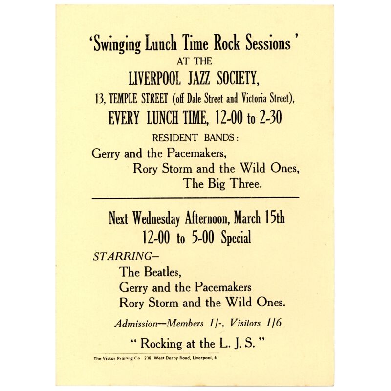 The Beatles. An original handbill for The Beatles performance at the 'Swinging Lunch Time Sessions' which took place at the Liverpool Jazz Society on March 15th 1961.