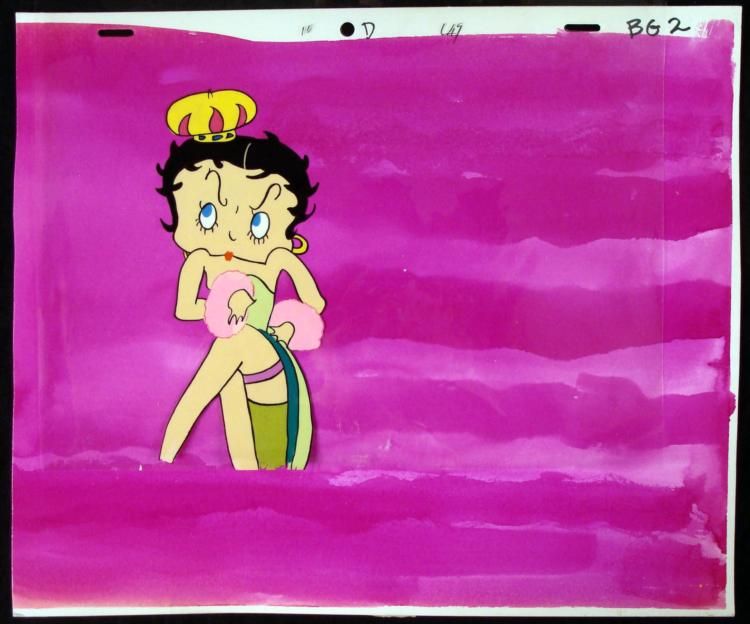 Betty Boop has a gold crown on her head. It appears that she is going to a party * * * Original Production Background and Animated CelMedium: Hand painted acetate celDetails: Numbers and peg holes * * Size of Background: 10 1/2 x 12 1/2 inchesSize of Cel: 8 1/4 x 10 3/4 inches * * Condition: Very Good * This is an original hand-painted cel set-up used in the production of an episode of "Betty Boop." Each one-of-a-kind set-up represents a slight change in position of the characters. When individually photographed and projected in rapid succession, the images * appear to move. * * To create production cels, the original animator's drawing is transferred onto an acetate cel (by hand-inking and/or photo copying). The cel is then hand-painted on the reverse side. The background accompanying this set-up is a hand-painted original production * background. *