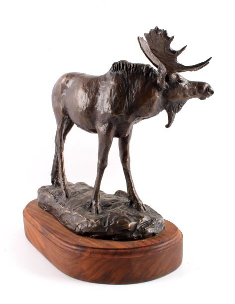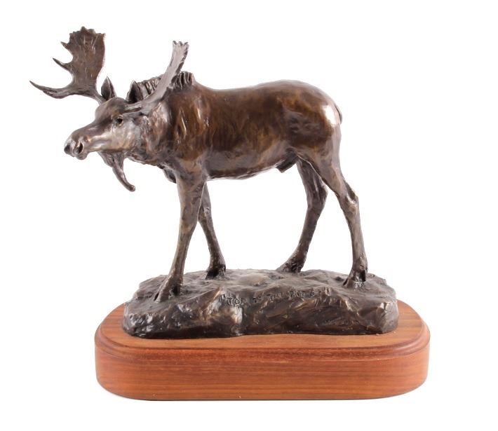 This is an original Bob Scriver bronze sculpture titled "Top of the Ridge". Robert Macfie Scriver (1914-1999) was born in Browning, Montana (in the heart of the Blackfoot Indian Reservation) in 1914. Scriver began sculpting using taxidermy to learn his craft of making wildlife bronzes. By 1962 he became a charter member of the Society of Animal Artists, had been accepted into the prestigious Cowboy Artists of America, listed in Who’s Who in American Art, and a member of the National Sculpture Society, and the National Academy of Western Art. Bob Scriver bronzes have been valued at over $30,000-$50,000. He is believed to be "The Cowboy’s National Sculptor" and one of the finest Montana bronze artists of the 20th century. This bronze shows a large Montana bull moose figure. The piece has been expertly sculpted by Scriver and shows fine detail and incredible artistic talent. The bronze sits upon a solid walnut hardwood base. The bronze is marked "Top of the Ridge". It shows the signature of the artist and is numbered 12/100. The Bob Scriver bronze is in good condition. It measures 7" x 12.5" and is 13" tall.