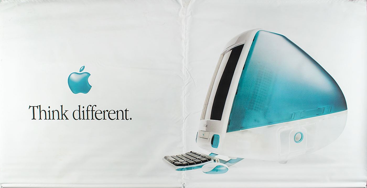 Uncommon original 70? x 36? vinyl promotional banner for the first iMac G3 personal computer released by Apple Computer in August 1998. The front of the double-sided banner features the iMac in its iconic Bondi Blue color next to the Apple logo and bold text: “Think different.” The back of the banner prominently reads “Apple” in large Lucida Grande font. Rolled and in fine condition, with the wrinkling inherent to all of these early Apple vinyl banners.