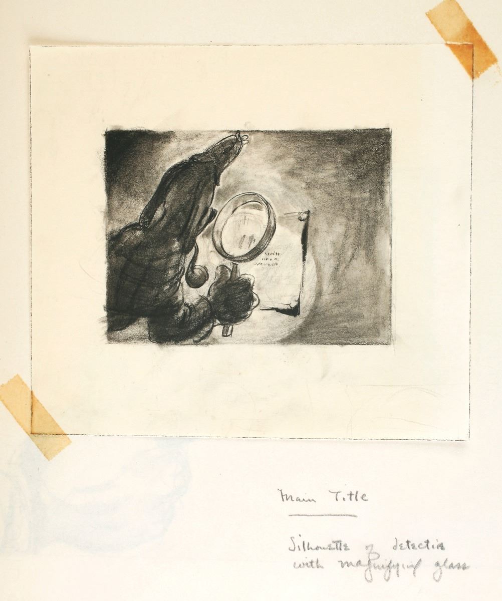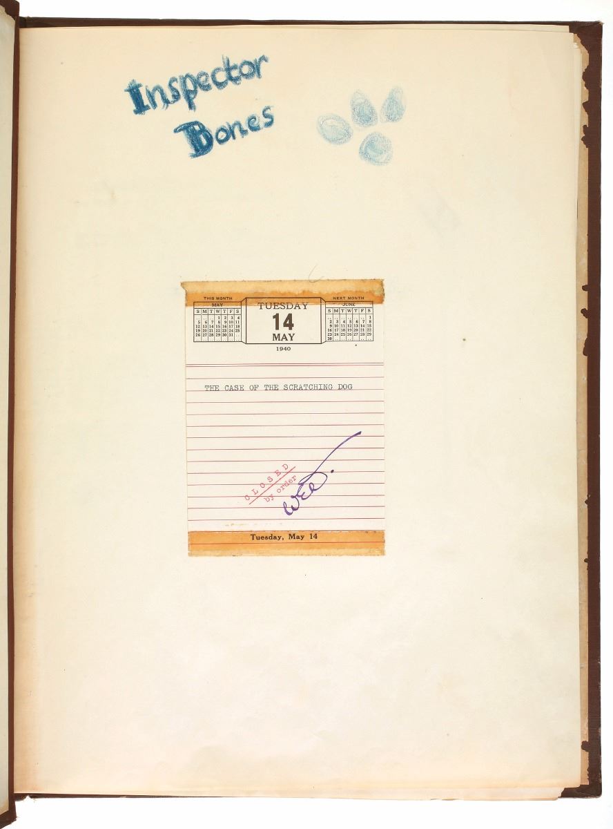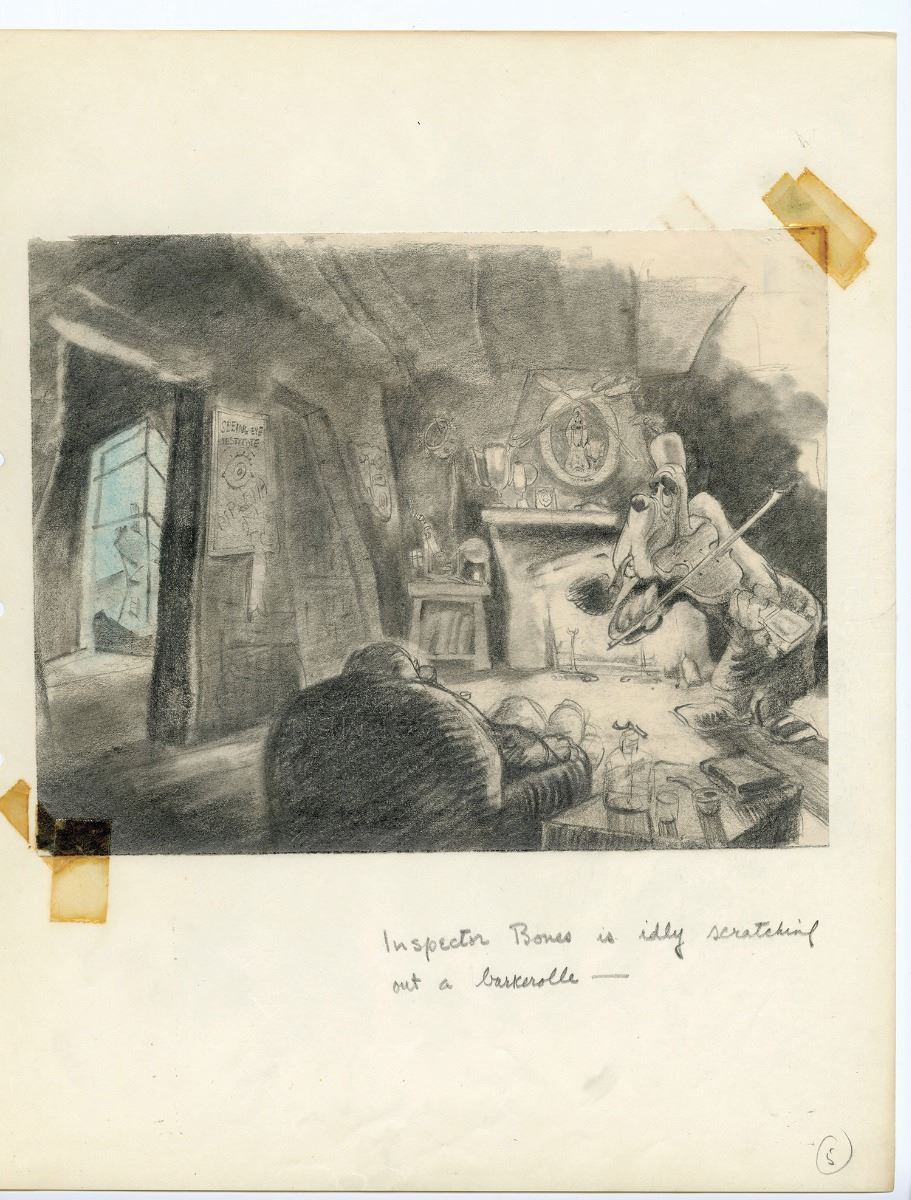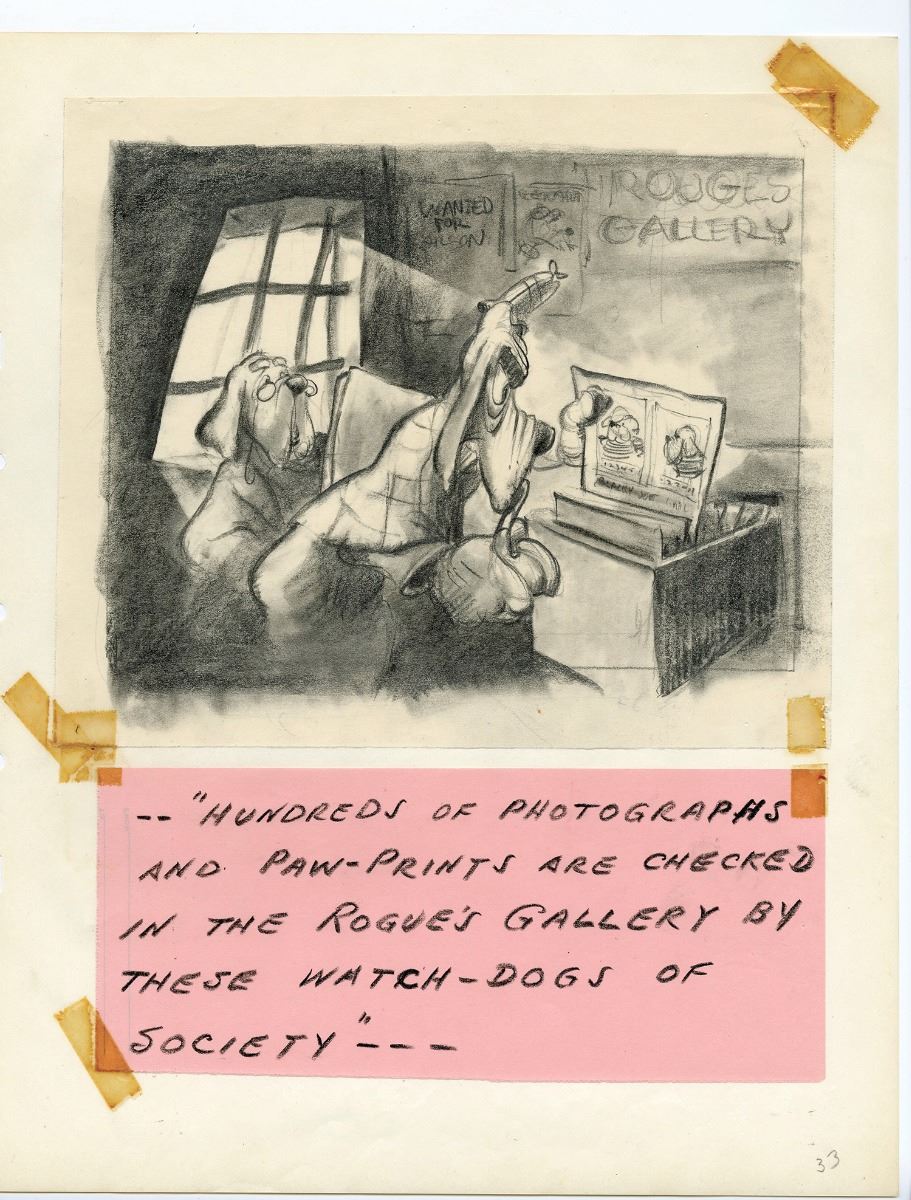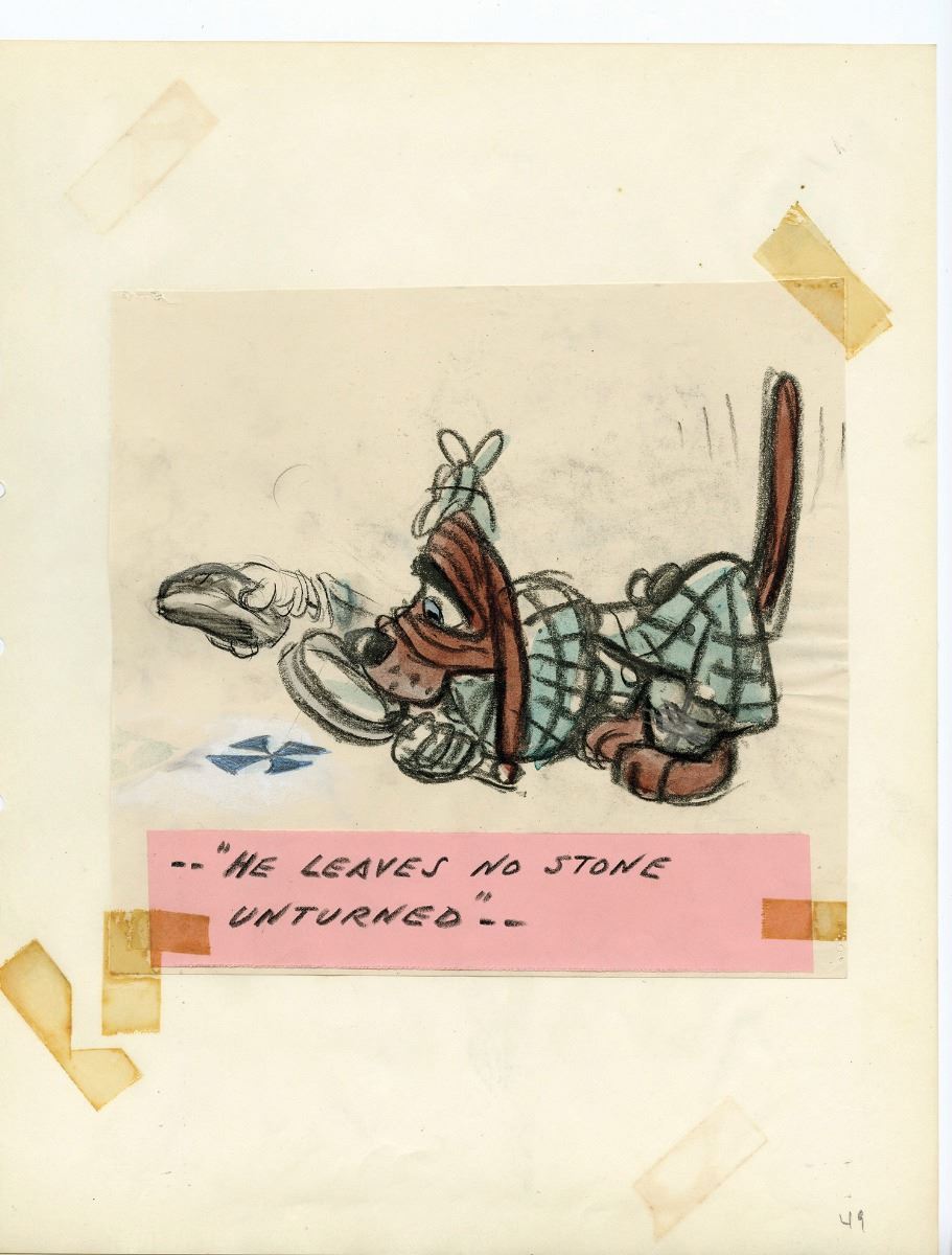 (Walt Disney Studios, 1940) In 1940, "Snow White" and "Pinocchio" storyman Otto Englander along with writer Dun Roman worked on a spoof of the popular Sherlock Holmes films of the time with a Basset Hound as the main character. Titled, "Inspector Bones; The Case of the Missing Circus", the project made it through the storyboarding stage of pre-production before being stopped due to wartime concerns. This amazing studio-bound book features (149) original storyboards that layout the film as they envisioned it. From the opening titles until the completion of the feature film, detailed drawings and layouts introduce you to a multitude of characters, suggest sight gags, and layout the story. Walt Disney himself approved the stop order by initialing the front page of the book. An unbelievable piece of Disney Studio history giving a detailed glimpse that very few will ever have into a Disney film that was never finished. Binder measures 16.5"x13.5" In fine condition. Contains every storyboard for the complete film except for the very last one. The last storyboard is currently part of the Walt Disney Archives collection and can be seen on page 158 of the book "The Disney that Never Was" by Charles Solomon.