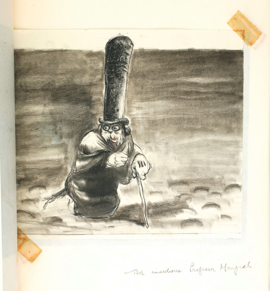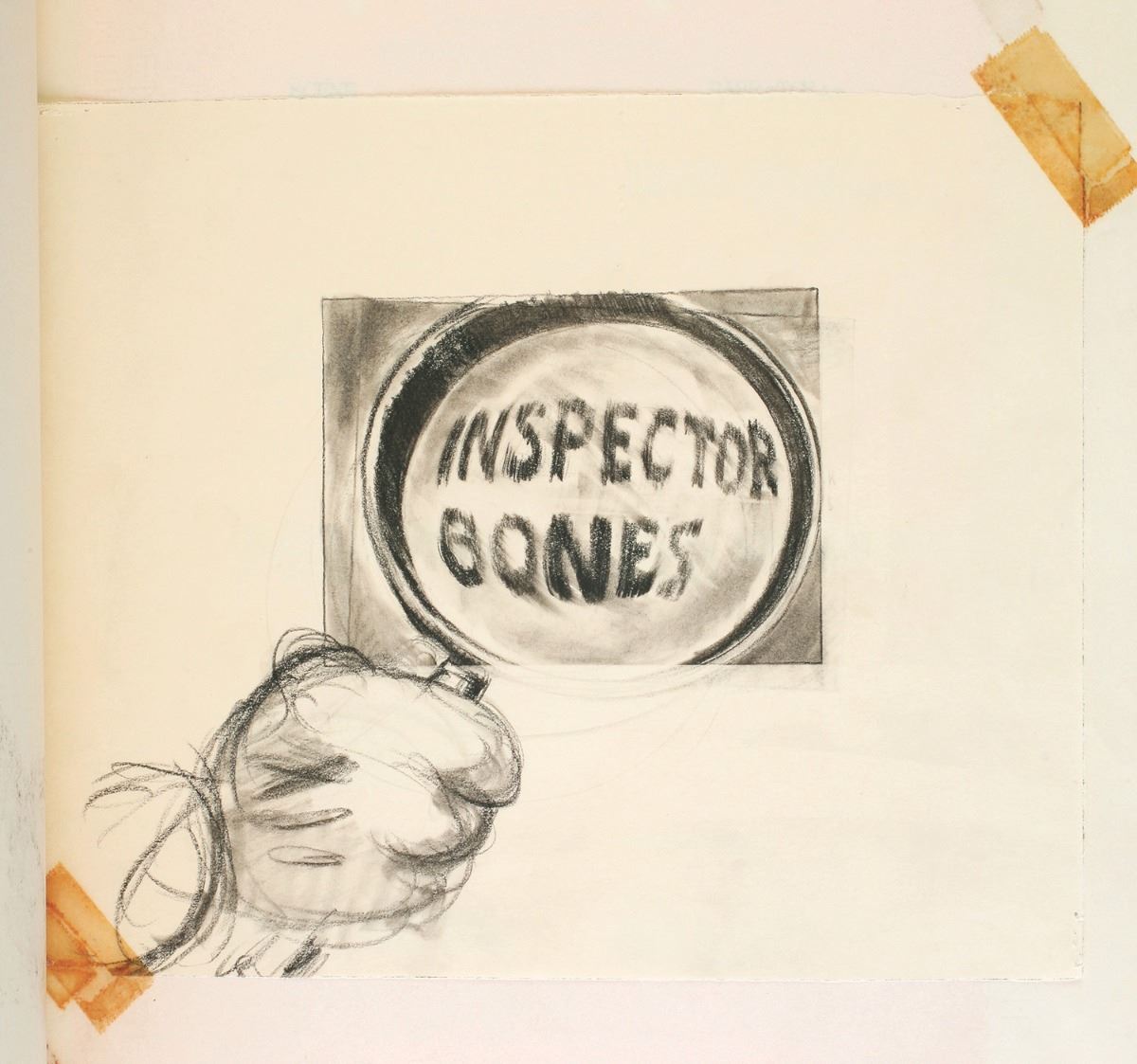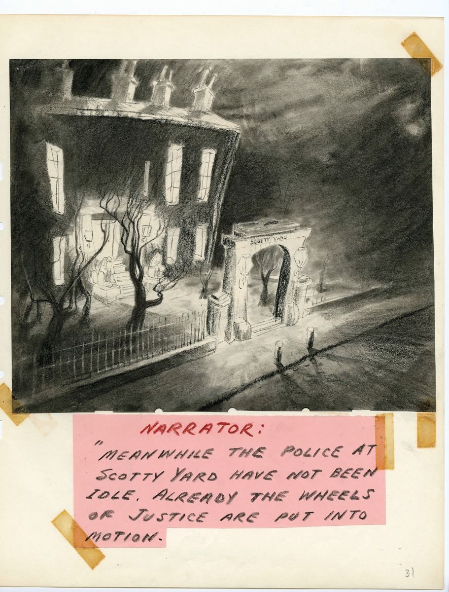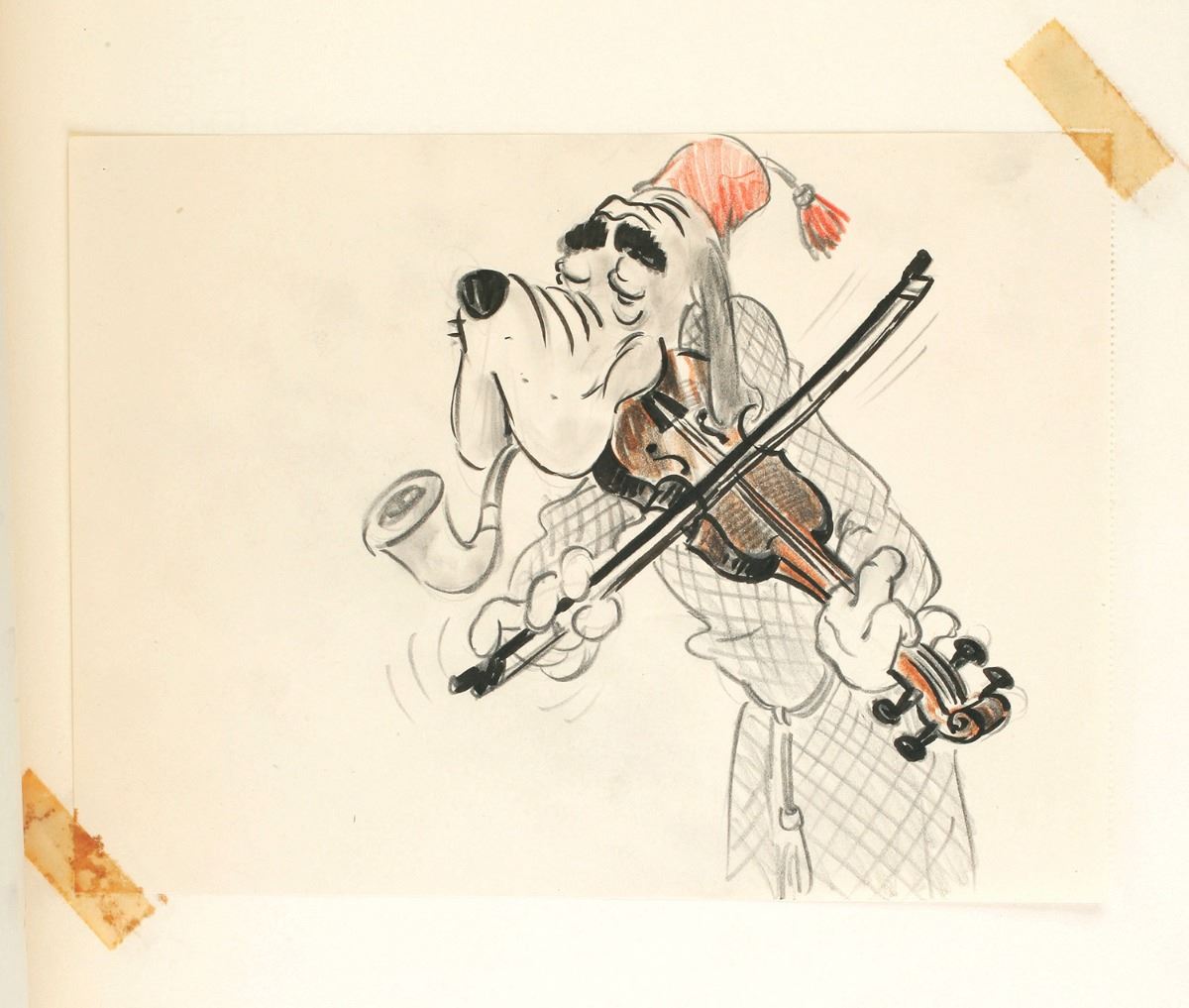 (Walt Disney Studios, 1940) In 1940, "Snow White" and "Pinocchio" storyman Otto Englander along with writer Dun Roman worked on a spoof of the popular Sherlock Holmes films of the time with a Basset Hound as the main character. Titled, "Inspector Bones; The Case of the Missing Circus", the project made it through the storyboarding stage of pre-production before being stopped due to wartime concerns. This amazing studio-bound book features (149) original storyboards that layout the film as they envisioned it. From the opening titles until the completion of the feature film, detailed drawings and layouts introduce you to a multitude of characters, suggest sight gags, and layout the story. Walt Disney himself approved the stop order by initialing the front page of the book. An unbelievable piece of Disney Studio history giving a detailed glimpse that very few will ever have into a Disney film that was never finished. Binder measures 16.5"x13.5" In fine condition. Contains every storyboard for the complete film except for the very last one. The last storyboard is currently part of the Walt Disney Archives collection and can be seen on page 158 of the book "The Disney that Never Was" by Charles Solomon.