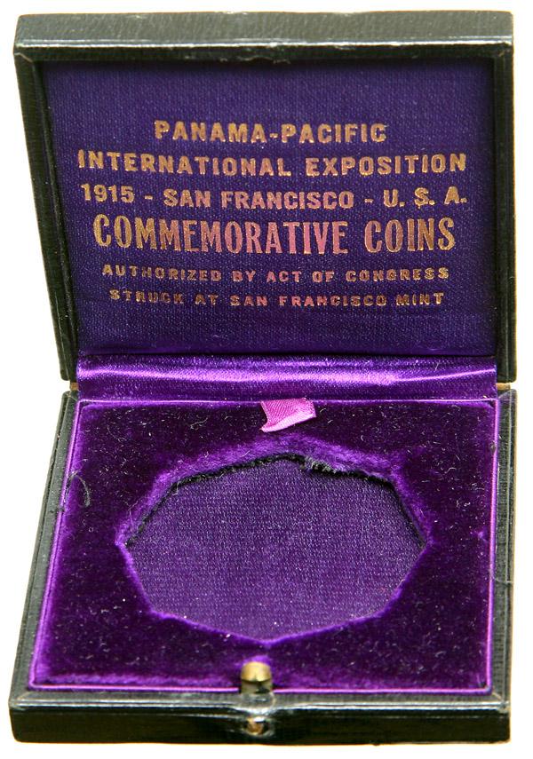 Original Box for the 1915-S Panama-Pacafic $50.00 Octagonal. Excellent condition. Box only, no coin. Many sales were made to banks throughout the country. Usually they were of special purple-plush boxed coins or sometimes in sets mounted in copper frames. With the close of the Exposition the rare coin exhibit of the Panama-Pacific fair was moved to the Palace of Fine Arts, where it looked very much at home and continued as a sales agency over the post-Exposition period until May 1, 1916. The Department was continued on a mail order basis, down to November 1, 1916, when, at the request of the Exposition and by authority of the Secretary of the Treasury, most of the coins remaining unsold were returned to the mint and destroyed. (Hence the high melt percentage of the $50 octagonal and round gold pieces, in particular.).