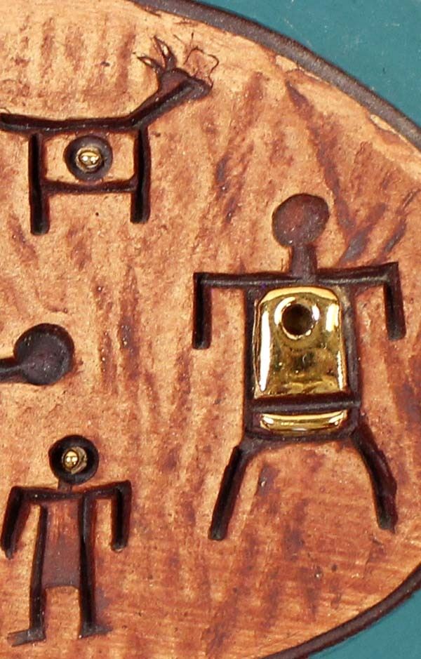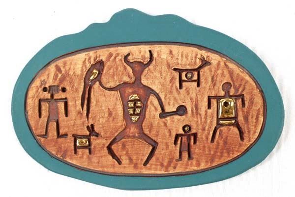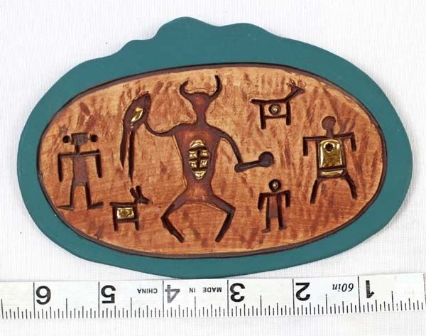 Original Brad Loving Shaman Petroglyph Pottery Plaque, measures 4'' x 6'' and is signed on the back, ready to hang