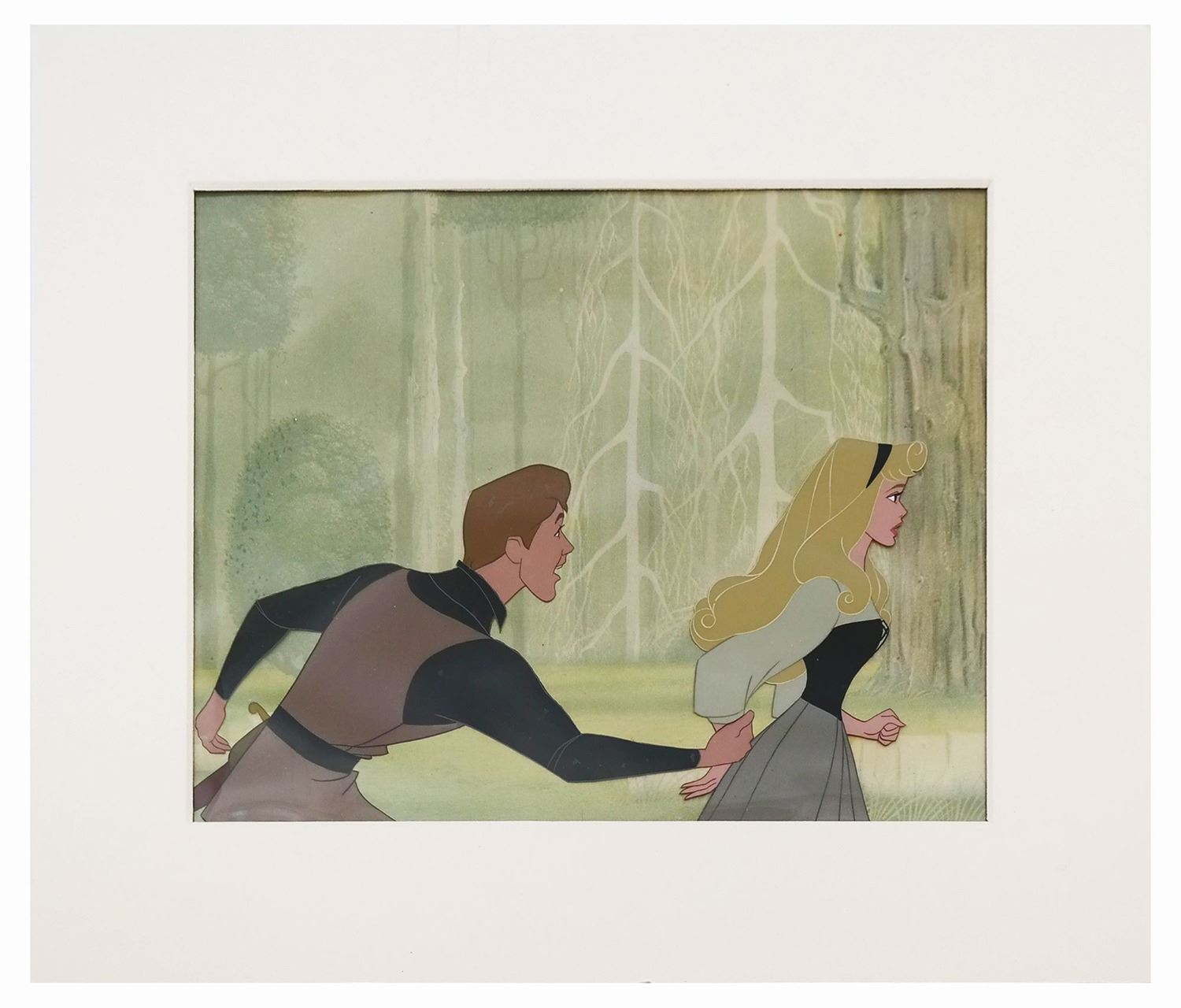 (Disney, 1959) A beautiful original production cel featuring Briar Rose and Prince Phillip from Sleeping Beauty. The cel was originally sold at the Art Corner in Tomorrowland and has been slightly trimmed to 8.5"x10" in order to fit into a standard Art Corner mat. It has since been re-matted, but retains its original Art Corner printed background. The total image size of the two characters is 4.5"x9". The cel is in very good condition with minor wear, with some wear to the mat.