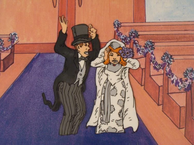 The bride and groom look very unhappy. * * * Original Animation Cel & Printed Background * * Medium: Hand painted acetate celDetails: Animation notations and peg holes * * Size of cel: 10 1/2 x 12 1/2 inchesSize of background: 11 x 14 inches * * Condition: Excellent * * * This is an original hand-painted cel set-up. Each one-of-a-kind set-up represents a slight change in position of the characters. When individually photographed and projected in rapid succession, the images appear to move. * * To create production cels, the original animator's drawing is transferred onto an acetate cel (by hand-inking and/or photo copying). The cel is then hand-painted on the reverse side. The background accompanying this set-up is a printed reproduction background. * The cel and background are in a protective sleeve. * * *