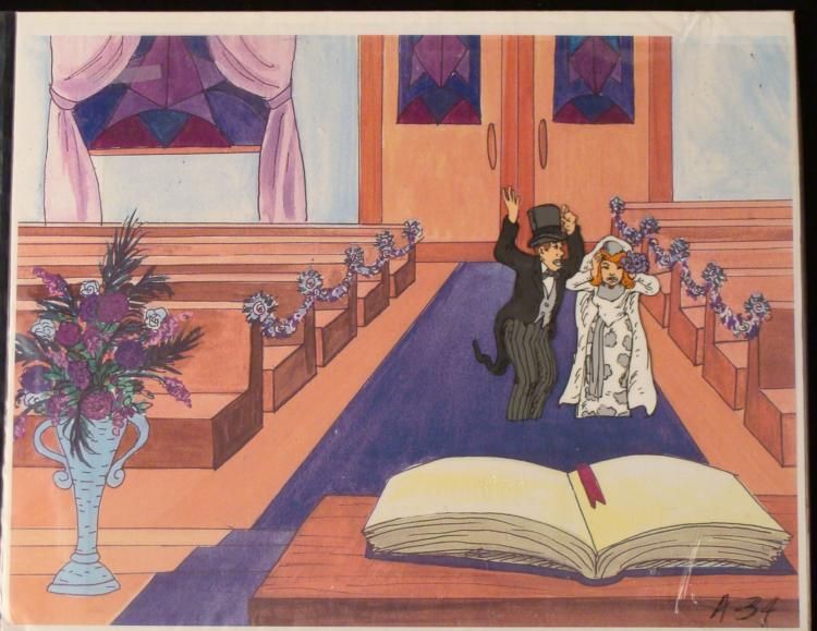 The bride and groom look very unhappy. Original Animation Cel & Printed Background Medium: Hand painted acetate celDetails: Animation notations and peg holes Size of cel: 10 1/2 x 12 1/2 inchesSize of background: 11 x 14 inches Condition: Excellent This is an original hand-painted cel set-up. Each one-of-a-kind set-up represents a slight change in position of the characters. When individually photographed and projected in rapid succession, the images appear to move. To create production cels, the original animator's drawing is transferred onto an acetate cel (by hand-inking and/or photo copying). The cel is then hand-painted on the reverse side. The background accompanying this set-up is a printed reproduction background. The cel and background are in a protective sleeve.