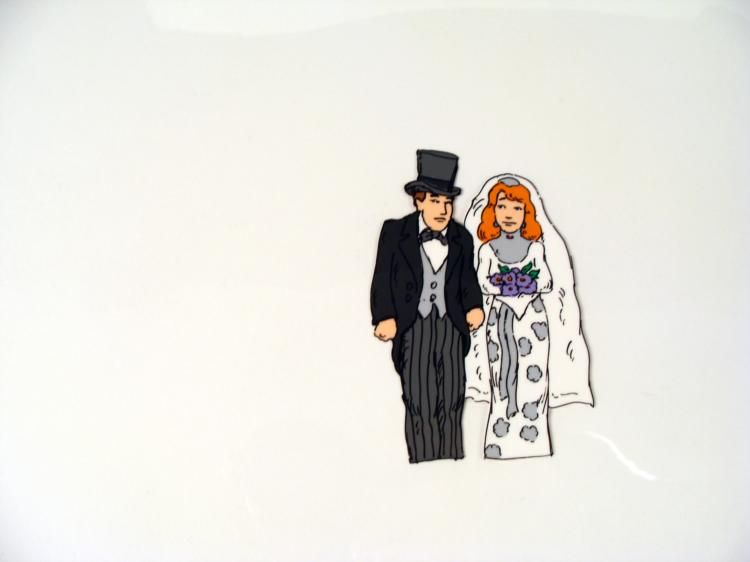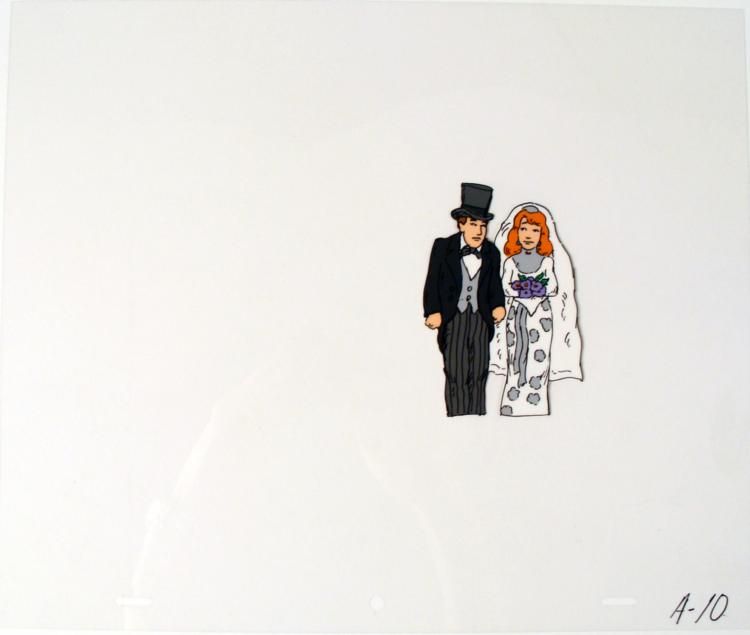 This is an original animation cel of a bride and groom. Do I sense having second thoughts?? Medium: Hand painted acetate cel Cel size: 10 1/2" x 12 1/2" Notations: Bottom of cel Condition: Excellent **The cel received by the winning bidder may be ever so slightly different from the one in the auction photo.